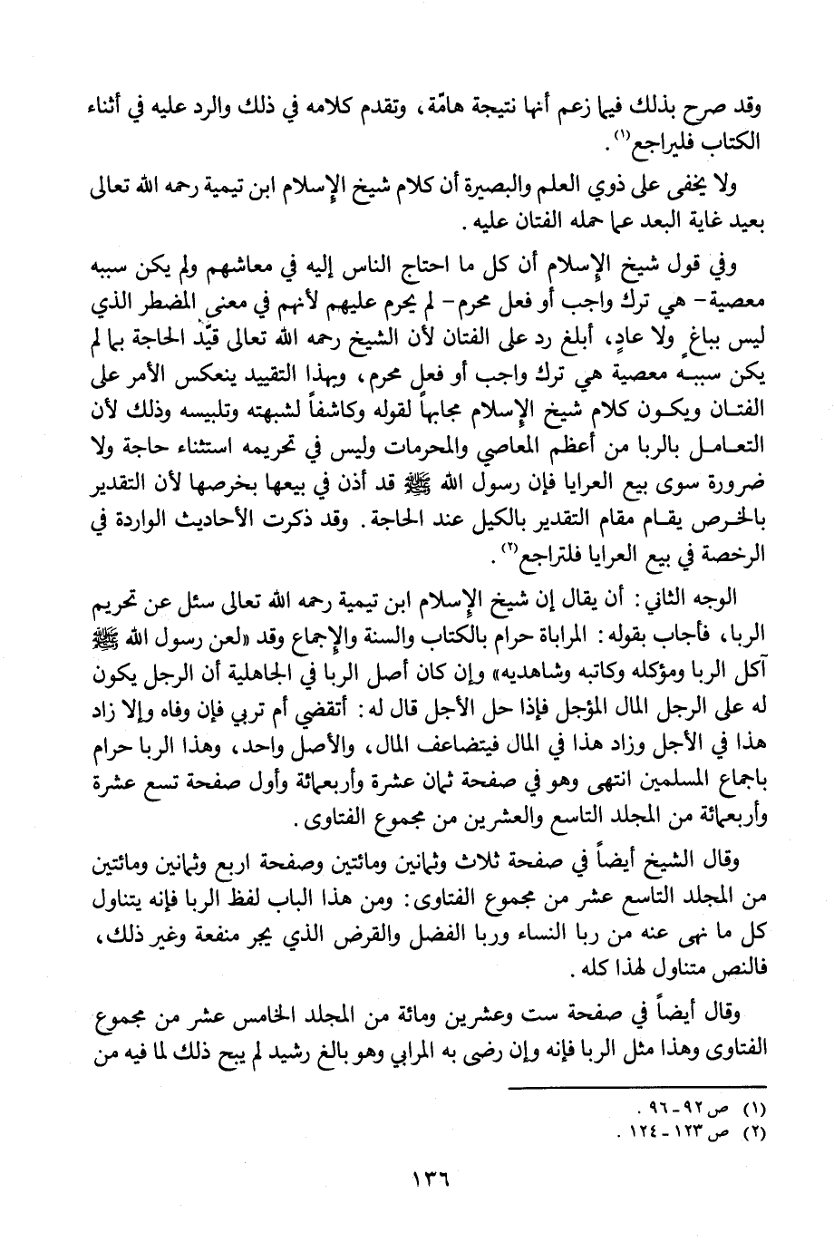 وفي قول شيخ الإسلام أن كل ما احتاج الناس إليه في معاشهم ولم يكن سببه معصية- هي ترك واجب أو فعل محرم - لم يحرم عليهم لأنهم في معنى المضطر الذي ليس بباغ ولا عاد، أبلغ رد على الفتان لأن الشيخ -رحمه الله تعالى- قيَّد الحاجة بما لم يكن سببه معصية هي ترك واجب أو فعل محرم، وبهذا التقييد ينعكس الأمر على الفتان ويكون كلام شيخ الإسلام مجابهًا لقوله وكاشفًا لشبهته وتلبيسه؛ وذلك لأن التعامل بالربا من أعظم المعاصي والمحرمات وليس في تحريمه استثناء حاجة ولا ضرورة سوى بيع العرايا فإن رسول الله - صلى الله عليه وسلم - قد أذن في بيعها بخرصها لأن التقدير بالخرص يقام مقام التقدير بالكيل عند الحاجة. وقد ذكرت الأحاديث الواردة في الرخصة في بيع العرايا فلتراجع (¬2).