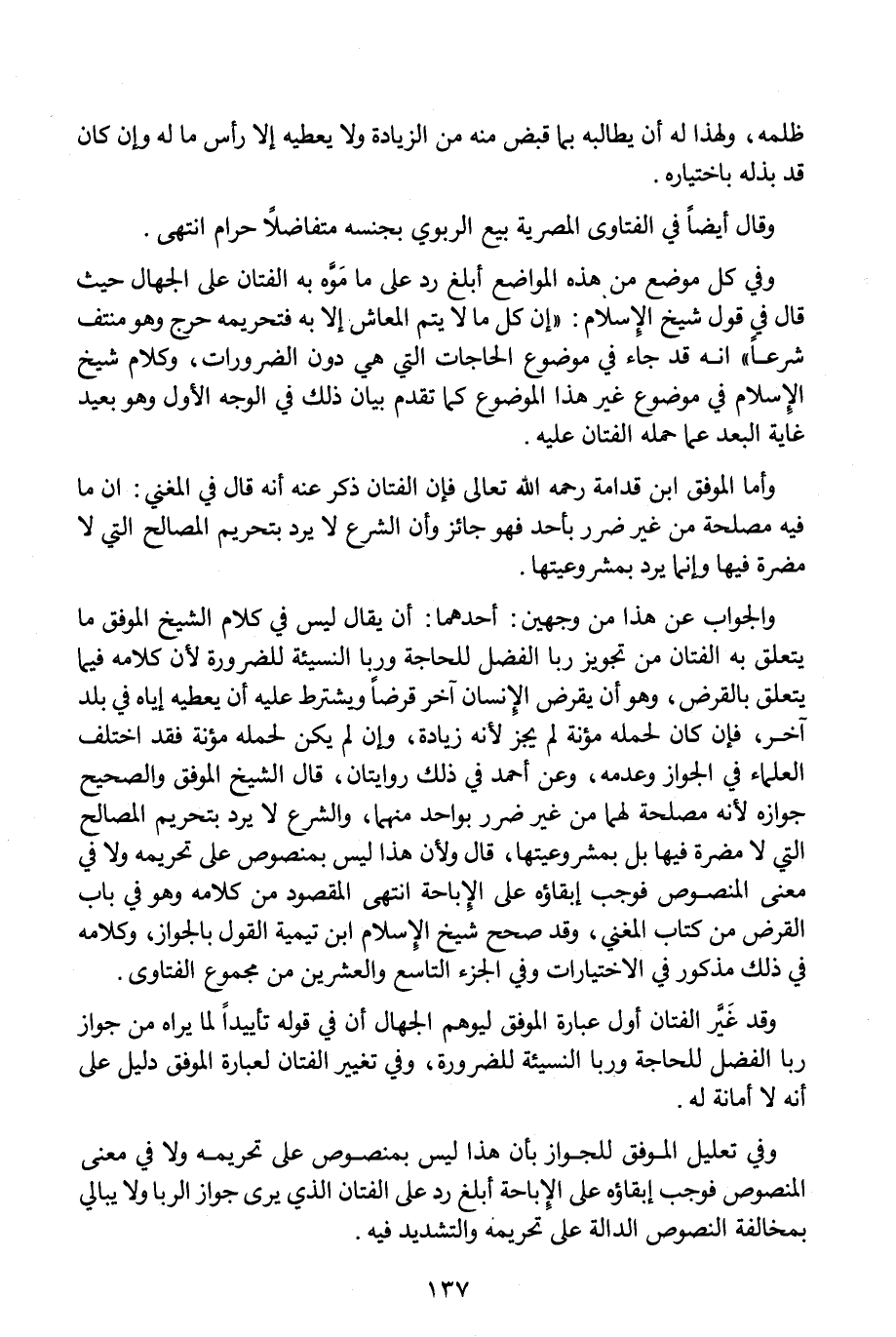 والجواب عن هذا من وجهين؛ أحدهما: أن يقال: ليس في كلام الشيخ الموفق ما يتعلق به الفتان من تجويز ربا الفضل للحاجة وربا النسيئة للضرورة؛ لأن كلامه فيما يتعلق بالقرض، وهو أن يقرض الإنسان آخر قرضا ويشترط عليه أن يعطيه إياه في بلد آخر، فإن كان لحمله مؤنة لم يجز لأنه زيادة، وإن لم يكن لحمله مؤنة فقد أختلف العلماء في الجواز وعدمه، وعن أحمد في ذلك روايتان، قال الشيخ الموفق: "والصحيح جوازه؛ لأنه مصلحة لهما من غير ضرر بواحد منهما، والشرع لا يرد بتحريم المصالح التي لا مضرة فيها بل بمشروعيتها، قال: ولأن هذا ليس بمنصوص على تحريمه ولا في معنى المنصوص فوجب إبقاؤه على الإباحة". انتهى المقصود من كلامه وهو في باب القرض من كتاب المغنى، وقد صحح شيخ الإسلام ابن تيمية القول بالجواز، وكلامه في ذلك مذكور في الاختيارات وفي الجزء التاسع والعشرين من مجموع الفتاوي.