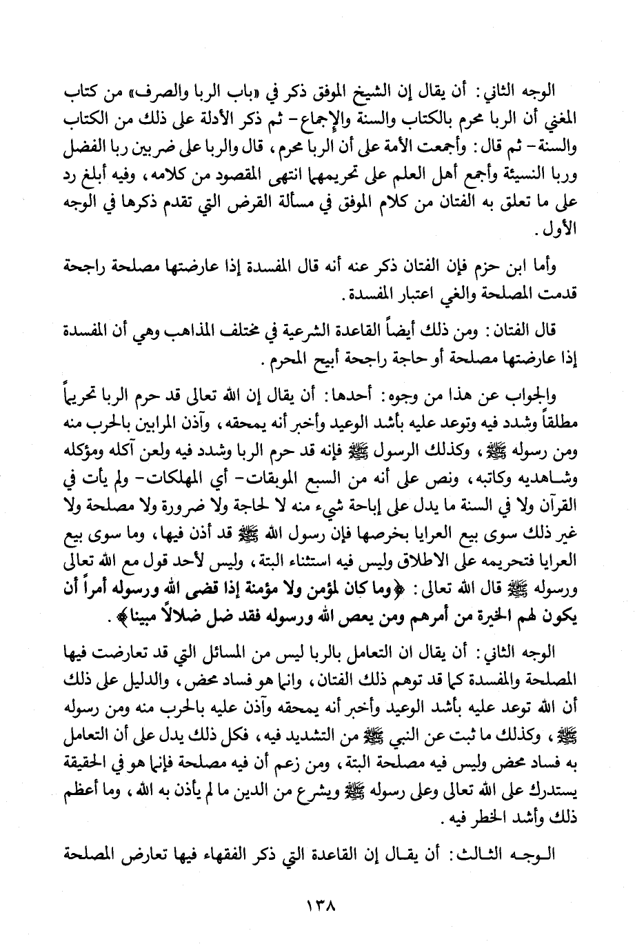 والجواب عن هذا من وجوه؛ أحدها: أن يقال: إن الله -تعالى- قد حرم الربا تحريمًا مطلقًا وشدد فيه وتوعد عليه بأشد الوعيد وأخبر أنه يمحقه، وآذن المرابين بالحرب منه ومن رسوله - صلى الله عليه وسلم -، وكذلك الرسول - صلى الله عليه وسلم - فإنه قد حرم الربا وشدد فيه ولعن آكله ومؤكله وشاهديه وكاتبه، ونص على أنه من السبع الموبقات - أي المهلكات - ولم يأت في القرآن ولا في السنة ما يدل على إباحة شيء منه لا لحاجة ولا ضرورة ولا مصلحة ولا غير ذلك سوى بيع العرايا بخرصها فإن رسول الله - صلى الله عليه وسلم - قد أذن فيها، وما سوى بيع العرايا فتحريمه على الإطلاق وليس فيه استثناء البتة، وليس لأحد قول مع الله -تعالى- ورسوله - صلى الله عليه وسلم -، قال الله -تعالى-: {وَمَا كَانَ لِمُؤْمِنٍ وَلَا مُؤْمِنَةٍ إِذَا قَضَى اللَّهُ وَرَسُولُهُ أَمْرًا أَنْ يَكُونَ لَهُمُ الْخِيَرَةُ مِنْ أَمْرِهِمْ وَمَنْ يَعْصِ اللَّهَ وَرَسُولَهُ فَقَدْ ضَلَّ ضَلَالاً مُبِينًا}.