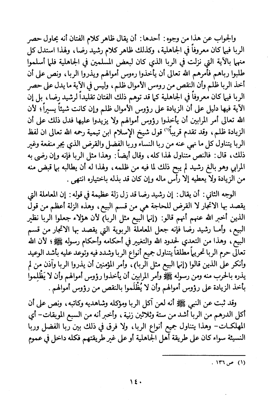 والجواب عن هذا من وجوه؛ أحدها: أن يقال: ظاهر كلام الفتان أنه يحاول حصر الربا فيما كان معروفًا في الجاهلية، وكذلك ظاهر كلام رشيد رضا، ولهذا استدل كل منهما بالآية التي نزلت في الربا الذي كان لبعض المسلمين في الجاهلية فلما أسلموا طلبوا رباهم فأمرهم الله -تعالى- أن يأخذوا رؤوس أموالهم ويذروا الربا، ونص على أن أخذ الربا ظلم وأن النقص من رؤوس الأموال ظلم، وليس في الآية ما يدل على حصر الربا فيما كان معروفًا في الجاهلية كما قد توهم ذلك الفتان تقليدًا لرشيد رضا، بل إن الآية فيها دليل على أن الزيادة على رؤوس الأموال ظلم وإن كانت شيئا يسيرًا؛ لأن الله -تعالى- أمر المرابين أن يأخذوا رؤوس أموالهم ولا يزيدوا عليها فدل ذلك على أن الزيادة ظلم، وقد تقدم قريبا (¬1) قول شيخ الإسلام ابن تيمية -رحمه الله تعالى- أن لفظ الربا يتناول كل ما نهي عنه من ربا النساء وربا الفضل والقرض الذي يجر منفعة وغير ذلك، قال: فالنص متناول لهذا كله، وقال أيضا: وهذا مثل الربا فإنه وإن رضي به المرابي وهو بالغ رشيد لم يبح ذلك لما فيه من ظلمه، ولهذا له أن يطالبه بما قبض منه من الزيادة ولا يعطيه إلا رأس ماله وإن كان قد بذله باختياره. انتهى.