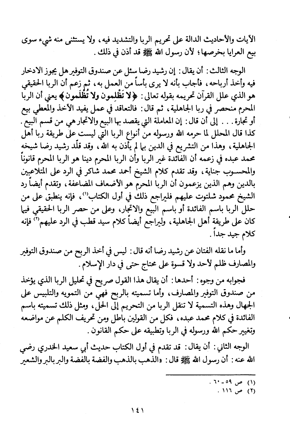 فجوابه من وجوه؛ أحدها: أن يقال: هذا القول صريح في تحليل الربا الذي يؤخذ من صندوق التوفير والمصارف، وأما تسميته بالربح فهي من التمويه والتلبيس على الجهال وهذه التسمية لا تنقل الربا من التحريم إلى الحل، ومثل ذلك تسميته باسم الفائدة في كلام محمد عبده، فكل من القولين باطل ومن تحريف الكلم عن مواضعه وتغيير حكم الله ورسوله في الربا وتطبيقه على حكم القانون.