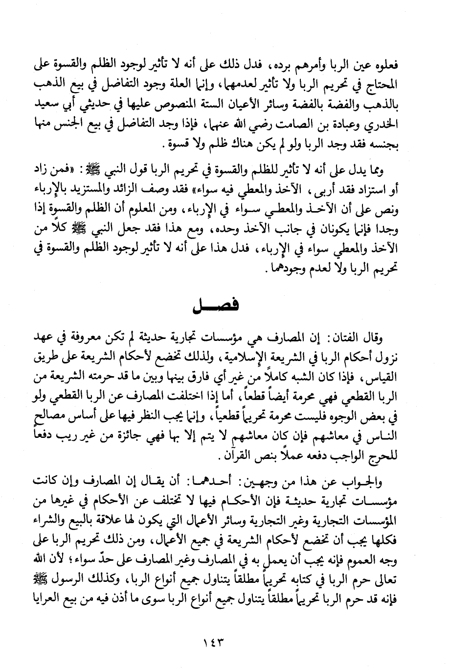 والجواب عن هذا من وجهين؛ أحدهما: أن يقال: إن المصارف وإن كانت مؤسسات تجارية حديثة فإن الأحكام فيها لا تختلف عن الأحكام في غيرها من المؤسسات التجارية وغير التجارية وسائر الأعمال التي يكون لها علاقة بالبيع والشراء فكلها يجب أن تخضع لأحكام الشريعة في جميع الأعمال، ومن ذلك تحريم الربا على وجه العموم فإنه يجب أن يعمل به في المصارف وغير المصارف على حد سواء؛ لأن الله -تعالى- حرم الربا في كتابه تحريما مطلقًا بتناول جميع أنواع الربا، وكذلك الرسول - صلى الله عليه وسلم - فإنه قد حرم الربا تحريما مطلقًا يتناول جميع أنواع الربا سوى ما أذن فيه من بيع العرايا ................................