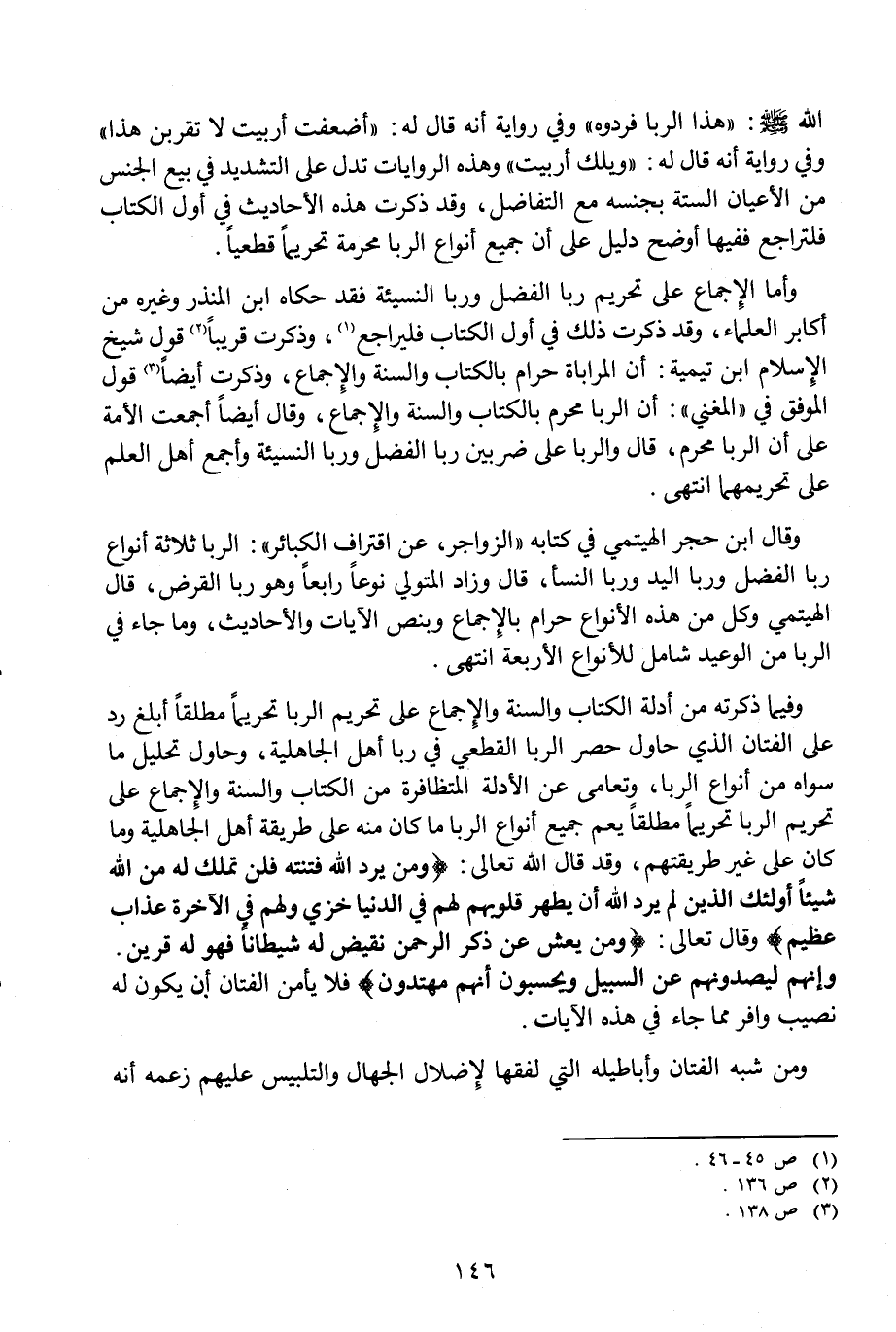 وقال ابن حجر الهيتمي في كتابه (الزواجر عن اقتراف الكبائر): "الربا ثلاثة أنواع ربا الفضل وربا اليد وربا النسأ، قال: وزاد المتولي نوعًا رابعًا وهو ربا القرض، قال الهيتمي: وكل من هذه الأنواع حرام بالإجماع وبنص الآيات والأحاديث، وما جاء في الربا من الوعيد شامل للأنواع الأربعة". انتهي.