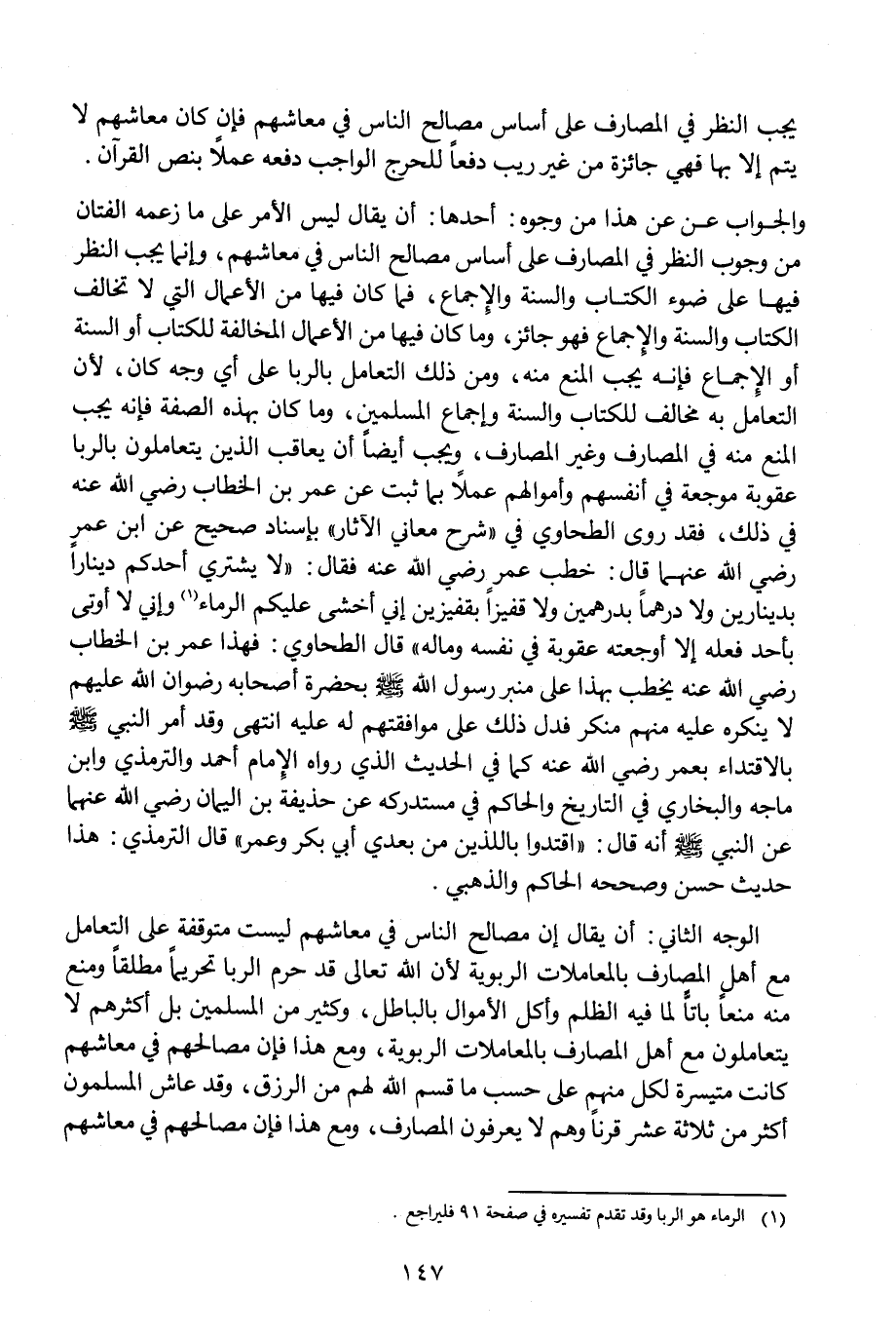 والجواب عن هذا من وجوه؛ أحدها: أن يقال: ليس الأمر على ما زعمه الفتان من وجوب النظر في المصارف على أساس مصالح الناس في معاشهم، وإنما يجب النظر فيها على ضوء الكتاب والسنة والإجماع، فما كان فيها من الأعمال التي لا تخالف الكتاب والسنة والإجماع فهو جائز، وما كان فيها من الأعمال المخالفة للكتاب أو السنة أو الإجماع فإنه يجب المنع منه، ومن ذلك التعامل بالربا على أي وجه كان؛ لأن التعامل به مخالف للكتاب والسنة وإجماع المسلمين، وما كان بهذه الصفة فإنه يجب المنع منه في المصارف وغير المصارف، ويجب أيضا أن يعاقب الذين يتعاملون بالربا عقوبة موجعة في أنفسهم وأموالهم عملاً بما ثبت عن عمر بن الخطاب -رضي الله عنه- في ذلك، فقد روى الطحاوي في (شرح معاني الآثار) بإسناد صحيح عن ابن عمر -رضي الله عنهما- قال: "خطب عمر -رضي الله عنه- فقال: "لا يشتري أحدكم دينارًا بدينارين ولا درهما بدرهمين ولا قفيزا بقفيزين إني أخشى عليكم الرماء (¬1) وإني لا أوتى بأحد فعله إلا أوجعته عقوبة في نفسه وماله" قال الطحاوي: فهذا عمر بن الخطاب -رضي الله عنه- يخطب بهذا على منبر رسول الله - صلى الله عليه وسلم - بحضرة أصحابه -رضوان الله عليهم- لا ينكره عليه منهم منكر فدل ذلك على موافقتهم له عليه". انتهى، وقد أمر النبي - صلى الله عليه وسلم - بالاقتداء بعمر -رضي الله عنه- كما في الحديث الذي رواه الإمام أحمد والترمذي وابن ماجة والبخاري في التاريخ والحاكم في مستدركه عن حذيفة بن اليمان -رضي الله عنهما- عن النبي - صلى الله عليه وسلم - أن قال: «اقتدوا باللذين من بعدي أبي بكر وعمر» قال الترمذي: "هذا حديث حسن"، وصححه الحاكم والذهبي.