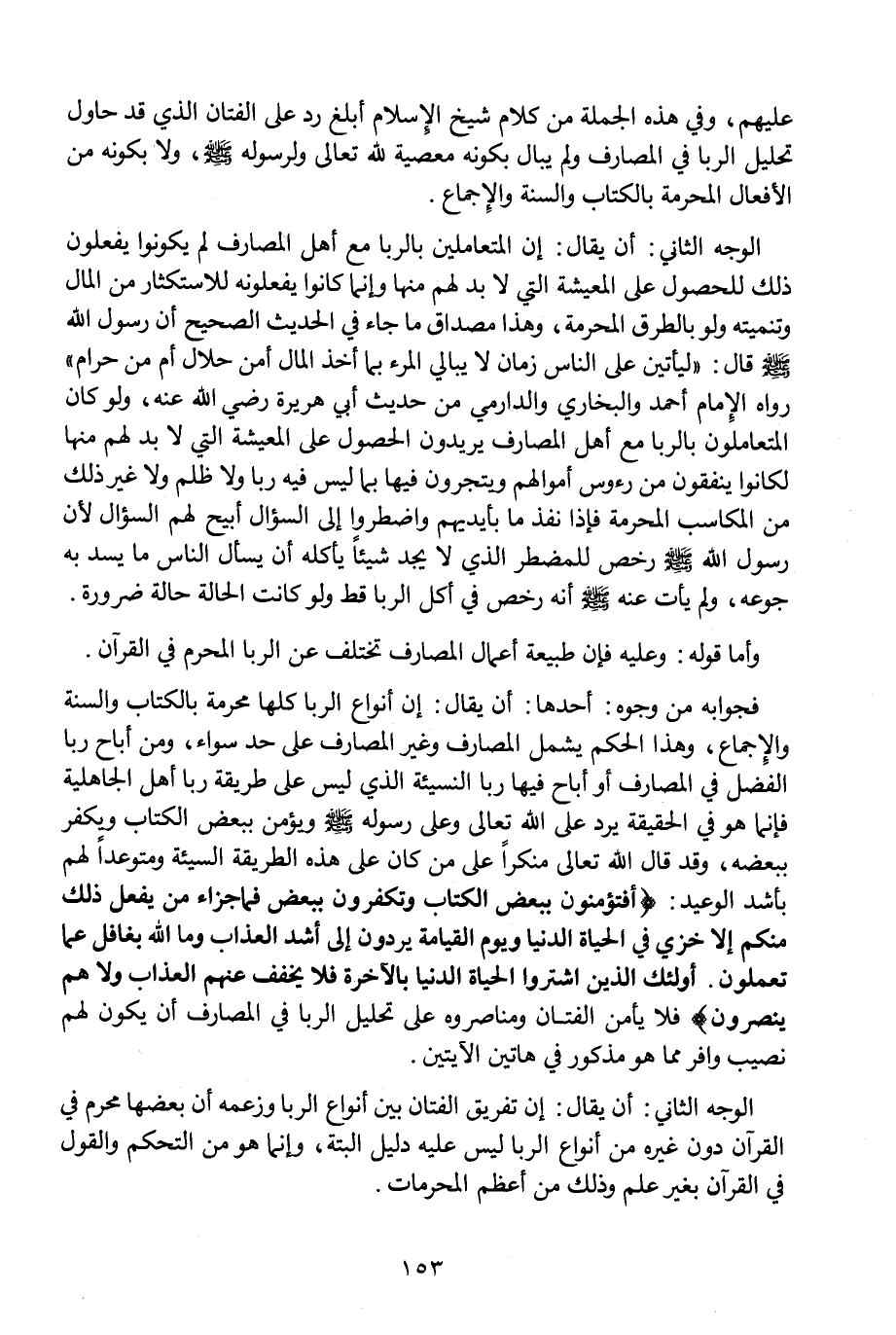 فجوابه من وجوه؛ أحدها: أن يقال: إن أنواع الربا كلها محرمة بالكتاب والسنة والإجماع، وهذا الحكم يشمل المصارف وغير المصارف على حد سواء، ومن أباح ربا الفضل في المصارف أو أباح فيها ربا النسيئة الذي ليس على طريقة ربا أهل الجاهلية فإنما هو في الحقيقة يرد على الله -تعالى- وعلى رسوله - صلى الله عليه وسلم - ويؤمن ببعض الكتاب ويكفر ببعضه، وقد قال الله -تعالى- منكرا على من كان على هذه الطريقة السيئة ومتوعدا لهم بأشد الوعيد: {أَفَتُؤْمِنُونَ بِبَعْضِ الْكِتَابِ وَتَكْفُرُونَ بِبَعْضٍ فَمَا جَزَاءُ مَنْ يَفْعَلُ ذَلِكَ مِنْكُمْ إِلَّا خِزْيٌ فِي الْحَيَاةِ الدُّنْيَا وَيَوْمَ الْقِيَامَةِ يُرَدُّونَ إِلَى أَشَدِّ الْعَذَابِ وَمَا اللَّهُ بِغَافِلٍ عَمَّا تَعْمَلُونَ * أُولَئِكَ الَّذِينَ اشْتَرَوُا الْحَيَاةَ الدُّنْيَا بِالْآَخِرَةِ فَلَا يُخَفَّفُ عَنْهُمُ الْعَذَابُ وَلَا هُمْ يُنْصَرُونَ}، فلا يأمن الفتان ومناصروه على تحليل الربا في المصارف أن يكون لهم نصيب وافر مما هو مذكور في هاتين الآيتين.