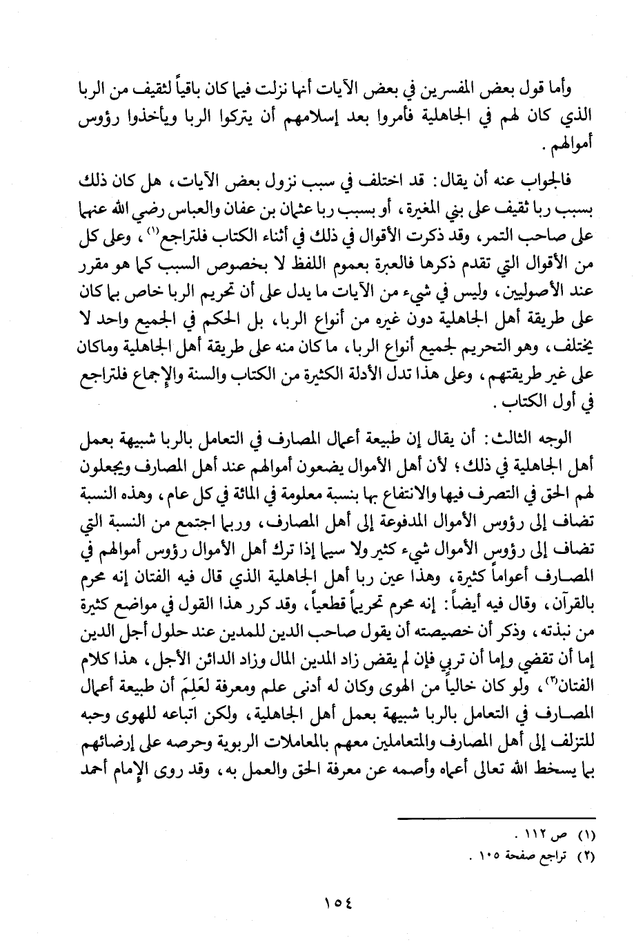 الوجه الثالث: أن يقال: إن طبيعة أعمال المصارف في التعامل بالربا شبيهة بعمل أهل الجاهلية في ذلك؛ لأن أهل الأموال يضعون أموالهم عند أهل المصارف ويجعلون لهم الحق في التصرف فيها والانتفاع بها بنسبة معلومة في المائة في كل عام، وهذه النسبة تضاف إلى رؤوس الأموال المدفوعة إلى أهل المصارف، وربما اجتمع من النسبة التي تضاف إلى رؤوس الأموال شيء كثير ولا سيما إذا ترك أهل الأموال رؤوس أموالهم في المصارف أعوامًا كثيرة، وهذا عين ربا أهل الجاهلية الذي قال فيه الفتان إنه محرم بالقرآن، وقال فيه أيضا: إنه محرم تحريما قطعيًا، وقد كرر هذا القول في مواضع كثيرة من نبذته، وذكر أن خصيصته أن يقول صاحب الدين للمدين عند حلول أجل الدين إما أن تقضي وإما أن تربي فإن لم يقض زاد المدين المال وزاد الدائن الأجل، هذا كلام الفتان (¬2)، ولو كان خاليا من الهوى وكان له أدنى علم ومعرفة لعلم أن طبيعة أعمال المصارف في التعامل بالربا شبيهة بعمل أهل الجاهلية، ولكن اتباعه للهوى وحبه للتزلف إلى أهل المصارف والمتعاملين معهم بالمعاملات الربوية وحرصه على إرضائهم بما يسخط الله -تعالى- أعماه وأصمه عن معرفة الحق والعمل به، وقد روى الإمام أحمد ....