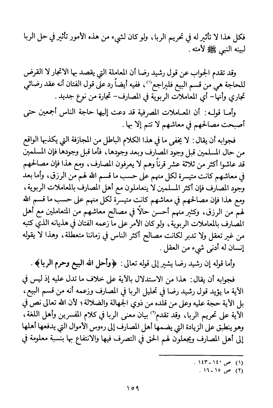 فجوابه: أن يقال: هذا من الاستدلال بالآية على خلاف ما تدل عليه إذ ليس في الآية ما يؤيد قول رشيد رضا في تحليل الربا في المصارف وزعمه أنه من قسم البيع، بل الآية حجة عليه وعلى من قلده من ذوي الجهالة والضلالة؛ لأن الله -تعالى- نص في الآية على تحريم الربا، وقد تقدم (¬2) بيان معنى الربا في كلام المفسرين وأهل اللغة، وهو ينطبق على الزيادة التي يضمنها أهل المصارف إلى رؤوس الأموال التي يدفعها أهلها إلى أهل المصارف ويجعلون لهم الحق في التصرف فيها والانتفاع بها بنسبة معلومة في .......................