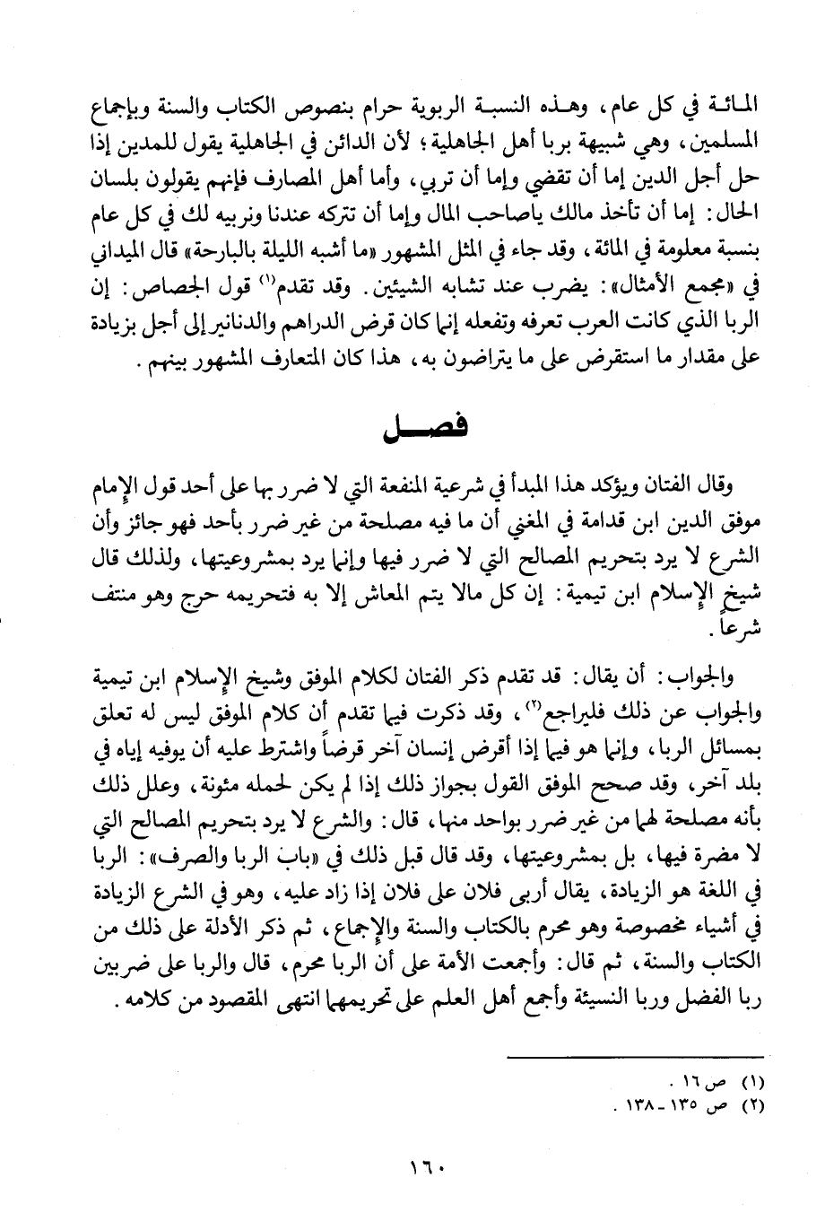 والجواب: أن يقال: قد تقدم ذكر الفتان لكلام الموفق وشيخ الإسلام ابن تيمية والجواب عن ذلك فليراجع (¬2)، وقد ذكرت فيما تقدم أن كلام الموفق ليس له تعلق بمسائل الربا، وإنما هو فيما إذا أقرض إنسان آخر قرضًا واشترط عليه أن يوفيه إياه في بلد آخر، وقد صحح الموفق القول بجواز ذلك إذا لم يكن لحمله مؤنة، وعلل ذلك بأنه مصلحة لهما من غير ضرر بواحد منها، قال: "والشرع لا يرد بتحريم المصالح التي لا مضرة فيها، بل بمشروعيتها"، وقد قال قبل ذلك في (باب الربا والصرف): "الربا في اللغة هو الزيادة، يقال أربى فلان على فلان إذا زاد عليه، وهو في الشرع الزيادة في أشياء مخصوصة وهو محرم بالكتاب والسنة والإجماع"، ثم ذكر الأدلة على ذلك من الكتاب والسنة، ثم قال: "وأجمعتْ الأمة على أن الربا محرم"، قال: "والربا على ضربين ربا الفضل وربا النسيئة وأجمع أهل العلم على تحريمهما". انتهى المقصود من كلامه.