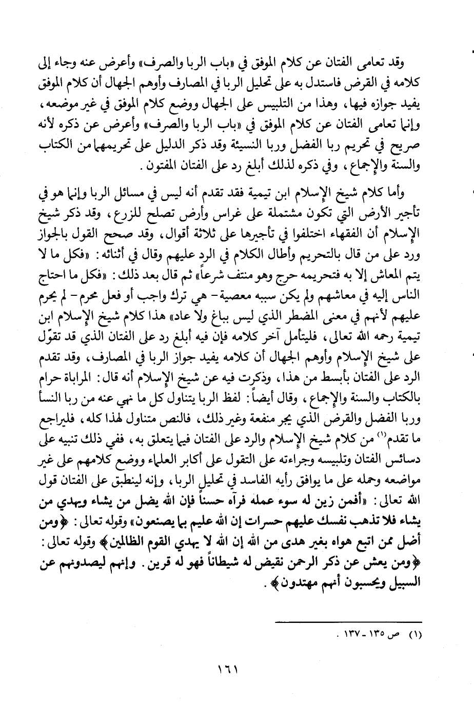 وأما كلام شيخ الإسلام ابن تيمية فقد تقدم أنه ليس في مسائل الربا وإنما هو في تأجير الأرض التي تكون مشتملة على غراس وأرض تصلح للزرع، وقد ذكر شيخ الإسلام أن الفقهاء اختلفوا في تأجيرها على ثلاثة أقوال، وقد صحح القول بالجواز ورد على من قال بالتحريم وأطال الكلام في الرد عليهم وقال في أثنائه: "فكل ما لا يتم المعاش إلا به فتحريمه حرج وهو منتف شرعًا" ثم قال بعد ذلك: "فكل ما احتاج الناس إليه في معاشهم ولم يكن سببه معصية - هي ترك واجب أو فعل محرم - لم يحرم عليهم لأنهم في معنى المضطر الذي ليس بباغ ولا عاد" هذا كلام شيخ الإسلام ابن تيمية -رحمه الله تعالى-، فليتأمل آخر كلامه فإن في أبلغ رد على الفتان الذي قد تقول على شيخ الإسلام وأوهم الجهال أن كلامه يفيد جواز الربا في المصارف، وقد تقدم الرد على الفتان بأبسط من هذا، وذكرت فيه عن شيخ الإسلام أنه قال: "المراباة حرام بالكتاب والسنة والإجماع"، وقال أيضا: "لفظ الربا يتناول كل ما نهي عنه من ربا النسأ وربا الفضل والقرض الذي يجر منفعة وغير ذلك، فالنص متناول لهذا كله"، فليراجع ما تقدم (¬1) من كلام شيخ الإسلام والرد على الفتان فيما يتعلق به، ففي ذلك تنبيه على دسائس الفتان وتلبيسه وجراءته على التقول على أكابر العلماء ووضع كلامهم على غير مواضعه وحمله على ما يوافق رأيه الفاسد في تحليل الربا، وإنه لينطبق على الفتان قول الله -تعالى-: {أَفَمَنْ زُيِّنَ لَهُ سُوءُ عَمَلِهِ فَرَآَهُ حَسَنًا فَإِنَّ اللَّهَ يُضِلُّ مَنْ يَشَاءُ وَيَهْدِي مَنْ يَشَاءُ فَلَا تَذْهَبْ نَفْسُكَ عَلَيْهِمْ حَسَرَاتٍ إِنَّ اللَّهَ عَلِيمٌ بِمَا يَصْنَعُونَ}، وقوله -تعالى-: {وَمَنْ أَضَلُّ مِمَّنَ اتَّبَعَ هَوَاهُ بِغَيْرِ هُدًى مِنَ اللَّهِ إِنَّ اللَّهَ لَا يَهْدِي الْقَوْمَ الظَّالِمِينَ}، وقوله -تعالى-: {وَمَنْ يَعْشُ عَنْ ذِكْرِ الرَّحْمَنِ نُقَيِّضْ لَهُ شَيْطَانًا فَهُوَ لَهُ قَرِينٌ * وَإِنَّهُمْ لَيَصُدُّونَهُمْ عَنِ السَّبِيلِ وَيَحْسَبُونَ أَنَّهُمْ مُهْتَدُونَ}.