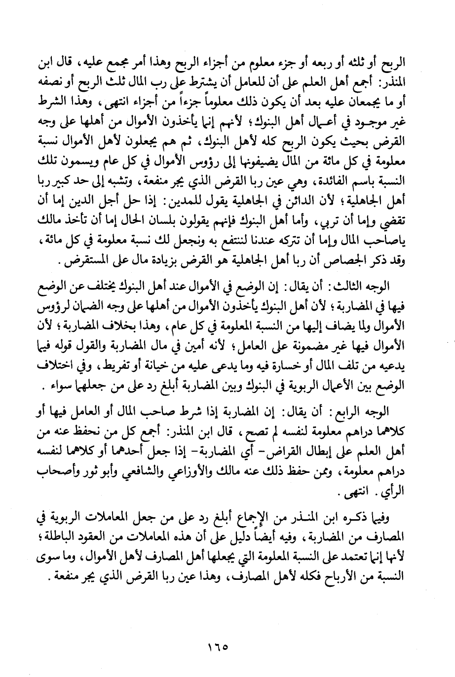 وفيما ذكره ابن المنذر من الإجماع أبلغ رد على من جعل المعاملات الربوية في المصارف من المضاربة، وفيه أيضا دليل على أن هذه المعاملات من العقود الباطلة؛ لأنها إنما تعتمد على النسبة المعلومة التي يجعلها أهل المصارف لأهل الأموال، وما سوى النسبة من الأرباح فكله لأهل المصارف، وهذا عين ربا القرض الذي يجر منفعة.
