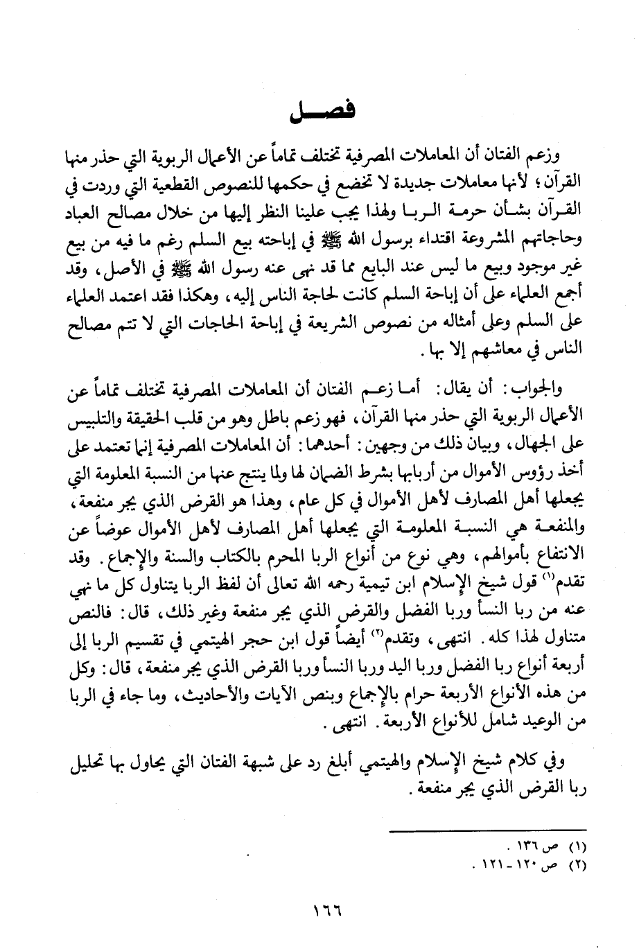 والجواب: أن يقال: أما زعم الفتان أن المعاملات المصرفية تختلف تمامًا عن الأعمال الربوية التي حذر منها القرآن، فهو زعم باطل وهو من قلب الحقيقة والتلبيس على الجهال، وبيان ذلك من وجهين؛ أحدهما: أن المعاملات المصرفية إنما تعتمد على أخذ رؤوس الأموال من أربابها بشرط الضمان لها ولما ينتج عنها من النسبة المعلومة التي يجعلها أهل المصارف لأهل الأموال في كل عام، وهذا هو القرض الذي يجر منفعة، والمنفعة هي النسبة المعلومة التي يجعلها أهل المصارف لأهل الأموال عوضا عن الانتفاع بأموالهم، وهي نوع من أنواع الربا المحرم بالكتاب والسنة والإجماع. وقد تقدم (¬1) قول شيخ الإسلام ابن تيمية -رحمه الله تعالى-: "إن لفظ الربا يتناول كل ما نهي عنه من ربا النسأ وربا الفضل والقرض الذي يجر منفعة وغير ذلك"، قال: "فالنص متناول لهذا كله"، وتقدم (¬2) أيضا قول ابن حجر الهيتمي في تقسيم الربا إلى أربعة أنواع ربا الفضل وربا اليد وربا النسأ وربا القرض الذي يجر منفعة، قال: "وكل من هذا الأنواع الأربعة حرام بالإجماع وبنص الآيات والأحاديث، وما جاء في الربا من الوعيد شامل للأنواع الأربعة". انتهى.
