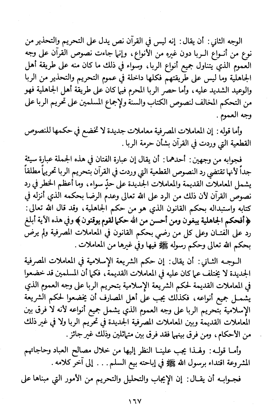 فجوابه من وجهين؛ أحدهما: أن يقال إن عبارة الفتان في هذه الجملة عبارة سيئة جدًا؛ لأنها تقتضي رد النصوص القطعية التي وردت في القرآن بتحريم الربا تحريمًا مطلقًا يشمل المعاملات القديمة والمعاملات الجديدة على حدٍ سواء، وما أعظم الخطر في رد نصوص القرآن؛ لأن ذلك من الرد على الله -تعالى- وعدم الرضا بحكمه الذي أنزله في كتابه واستبداله بحكم القانون الذي هو من حكم الجاهلية، وقد قال الله -تعالى-: {أَفَحُكْمَ الْجَاهِلِيَّةِ يَبْغُونَ وَمَنْ أَحْسَنُ مِنَ اللَّهِ حُكْمًا لِقَوْمٍ يُوقِنُونَ} وفي هذه الآية أبلغ رد على الفتان وعلى كل من رضي بحكم القانون في المعاملات المصرفية ولم يرض بحكم الله -تعالى- وحكم رسوله - صلى الله عليه وسلم - فيها وفي غيرها من المعاملات.