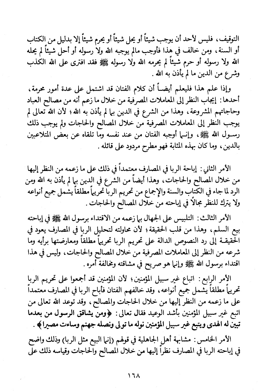 الأمر الرابع: اتباع غير سبيل المؤمنين؛ لأن المؤمنين قد أجمعوا على تحريم الربا تحريمًا مطلقًا يشمل جميع أنواعه، وقد خالفهم الفتان فأباح الربا في المصارف معتمدًا على ما زعمه من النظر إليها من خلال الحاجات والمصالح، وقد توعد الله -تعالى- من اتبع غير سبيل المؤمنين بأشد الوعيد فقال -تعالى-: {وَمَنْ يُشَاقِقِ الرَّسُولَ مِنْ بَعْدِ مَا تَبَيَّنَ لَهُ الْهُدَى وَيَتَّبِعْ غَيْرَ سَبِيلِ الْمُؤْمِنِينَ نُوَلِّهِ مَا تَوَلَّى وَنُصْلِهِ جَهَنَّمَ وَسَاءَتْ مَصِيرًا}.