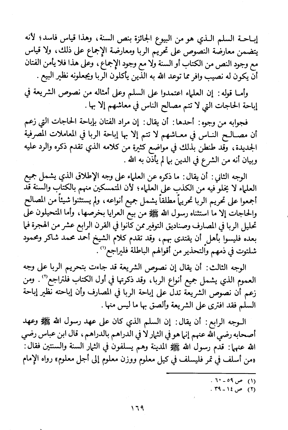 إباحة السلم الذي هو من البيوع الجائزة بنص السنة، وهذا قياس فاسد؛ لأنه يتضمن معارضة النصوص على تحريم الربا ومعارضة الإجماع على ذلك، ولا قياس مع وجود النص من الكتاب أو السنة ولا مع وجود الإجماع، وعلى هذا فلا يأمن الفتان أن يكون له نصيب وافر مما توعد الله به الذين يأكلون الربا ويجعلونه نظير البيع.
