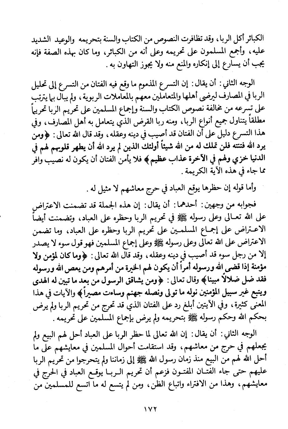 فجوابه من وجهين؛ أحدهما: أن يقال: إن هذه الجملة قد تضمنت الاعتراض على الله -تعالى- وعلى رسوله - صلى الله عليه وسلم - في تحريم الربا وحظره على العباد، وتضمنت أيضا الاعتراض على إجماع المسلمين على تحريم الربا وحظره على العباد، وما تضمن الاعتراض على الله -تعالى- وعلى رسوله - صلى الله عليه وسلم - وعلى إجماع المسلمين فهو قول سوء لا يصدر إلا من رجل سوء قد أصيب في دينه وعقله، وقد قال الله -تعالى-: {وَمَا كَانَ لِمُؤْمِنٍ وَلَا مُؤْمِنَةٍ إِذَا قَضَى اللَّهُ وَرَسُولُهُ أَمْرًا أَنْ يَكُونَ لَهُمُ الْخِيَرَةُ مِنْ أَمْرِهِمْ وَمَنْ يَعْصِ اللَّهَ وَرَسُولَهُ فَقَدْ ضَلَّ ضَلَالاً مُبِينًا}، وقال -تعالى-: {وَمَنْ يُشَاقِقِ الرَّسُولَ مِنْ بَعْدِ مَا تَبَيَّنَ لَهُ الْهُدَى وَيَتَّبِعْ غَيْرَ سَبِيلِ الْمُؤْمِنِينَ نُوَلِّهِ مَا تَوَلَّى وَنُصْلِهِ جَهَنَّمَ وَسَاءَتْ مَصِيرًا} والآيات في هذا المعنى كثيرة، وفي الآيتين أبلغ رد على الفتان الذي قد تحرج من تحريم الربا ولم يرض بحكم الله وحكم رسوله - صلى الله عليه وسلم - بتحريمه ولم يرض بإجماع المسلمين على تحريمه.