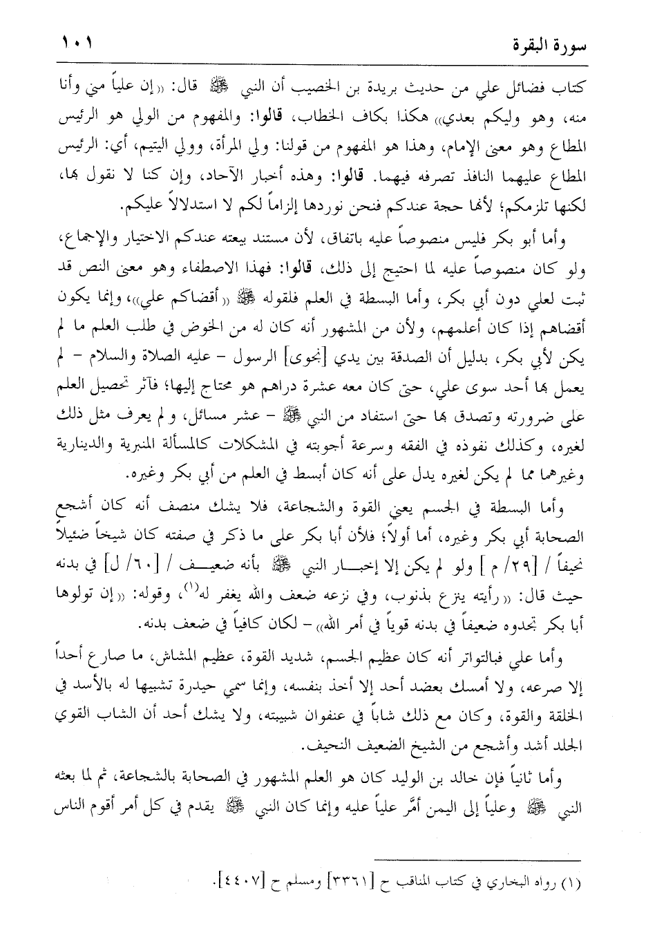 وأما ثانيا فإن خالد بن الوليد كان هو العلم المشهور في الصحابة بالشجاعة، ثم لما بعثه النبي صلّى الله عليه وسلّم وعليا إلى اليمن أمّر عليا عليه وإنما كان النبي صلّى الله عليه وسلّم يقدم في كل أمر أقوم الناس