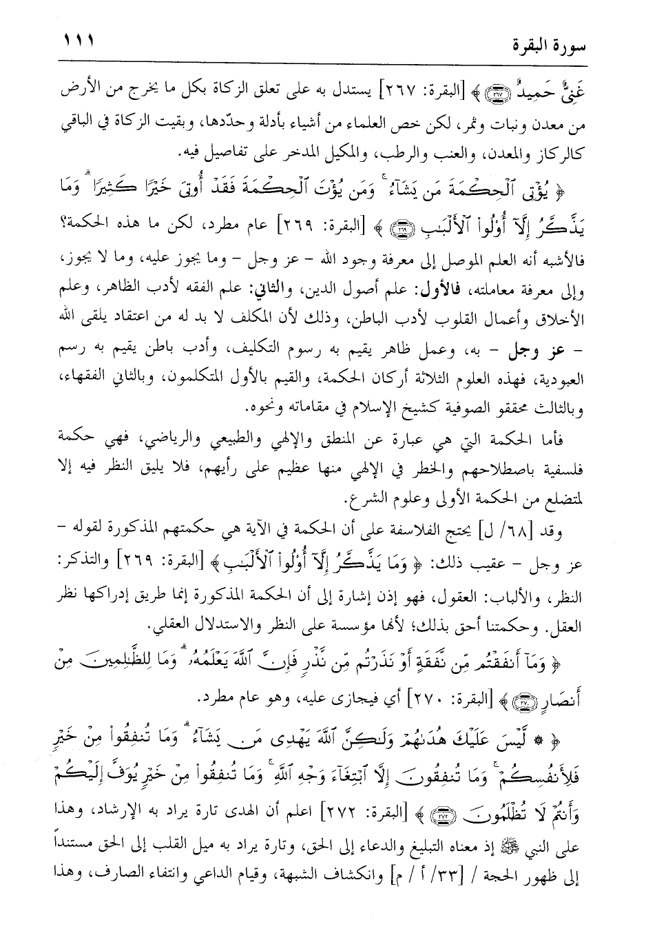 {يُؤْتِي الْحِكْمَةَ مَنْ يَشاءُ وَمَنْ يُؤْتَ الْحِكْمَةَ فَقَدْ أُوتِيَ خَيْراً كَثِيراً وَما يَذَّكَّرُ إِلاّ أُولُوا الْأَلْبابِ} (269) [البقرة: 269] عام مطرد، لكن ما هذه الحكمة؟ فالأشبه أنه العلم الموصل إلى معرفة وجود الله-عز وجل-وما يجوز عليه، وما لا يجوز، وإلى معرفة معاملته، فالأول: علم أصول الدين، والثاني: علم الفقه لأدب الظاهر، وعلم الأخلاق وأعمال القلوب لأدب الباطن، وذلك لأن المكلف لا بد له من اعتقاد يلقى الله -عز وجل-به، وعمل ظاهر يقيم به رسوم التكليف، وأدب باطن يقيم به رسم العبودية، فهذه العلوم الثلاثة أركان الحكمة، والقيم بالأول المتكلمون، وبالثاني الفقهاء، وبالثالث محققو الصوفية كشيخ الإسلام في مقاماته ونحوه.