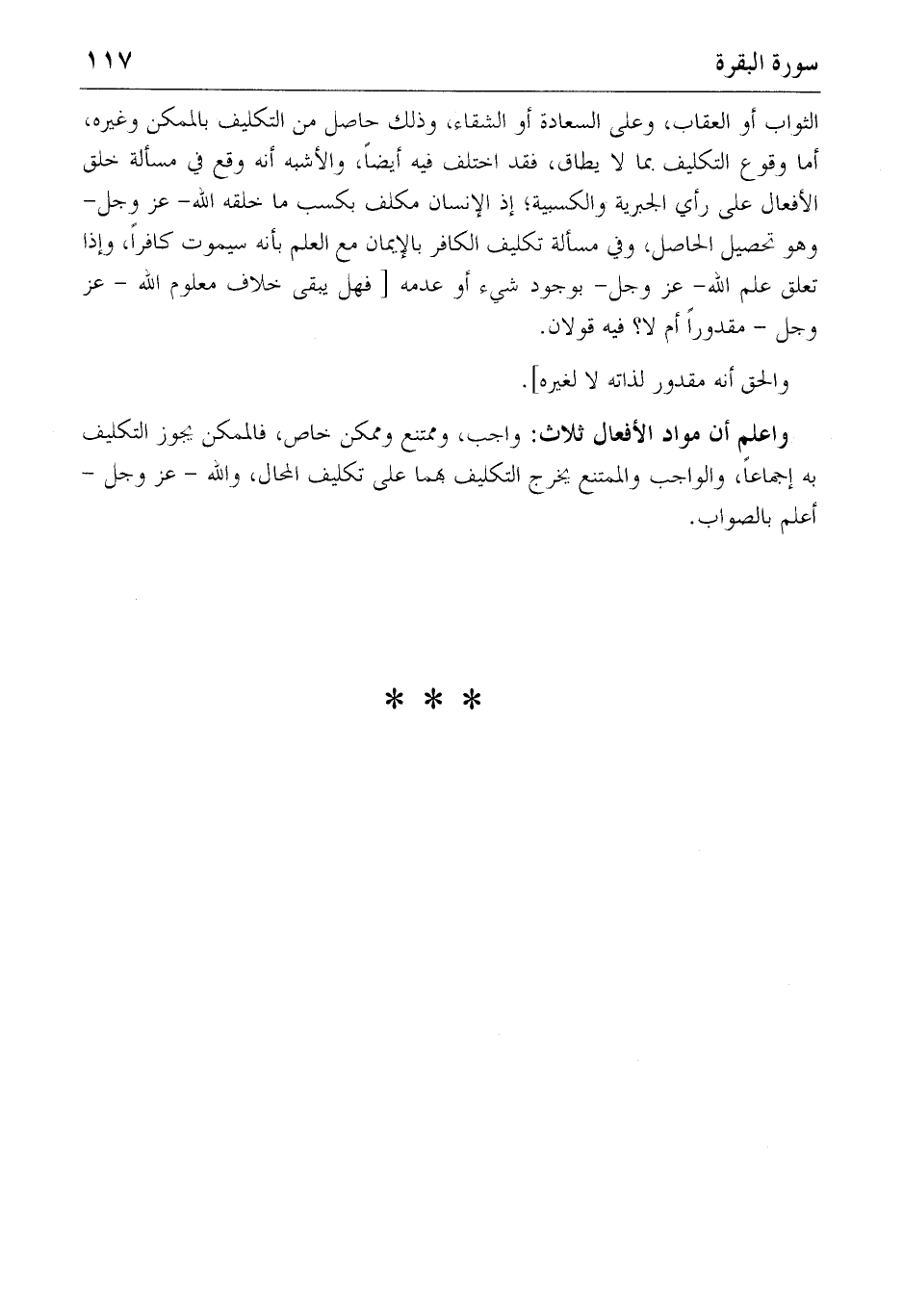واعلم أن مواد الأفعال ثلاث: واجب، وممتنع وممكن خاص، فالممكن يجوز التكليف به إجماعا، والواجب والممتنع يخرج التكليف بهما على تكليف المحال، والله-عز وجل- أعلم بالصواب.