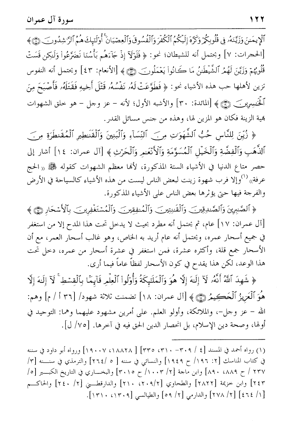 {زُيِّنَ لِلنّاسِ حُبُّ الشَّهَواتِ مِنَ النِّساءِ وَالْبَنِينَ وَالْقَناطِيرِ الْمُقَنْطَرَةِ مِنَ الذَّهَبِ وَالْفِضَّةِ وَالْخَيْلِ الْمُسَوَّمَةِ وَالْأَنْعامِ وَالْحَرْثِ} [آل عمران: 14] أشار إلى حصر متاع الدنيا في الأشياء الستة المذكورة، لأنها معظم الشهوات كقوله صلّى الله عليه وسلّم «الحج عرفة» (1) وإلا فرب شهوة زينت لبعض الناس ليست من هذه الأشياء كالسياحة في الأرض والفرجة فيها حتى يؤثرها بعض الناس على الأشياء المذكورة.