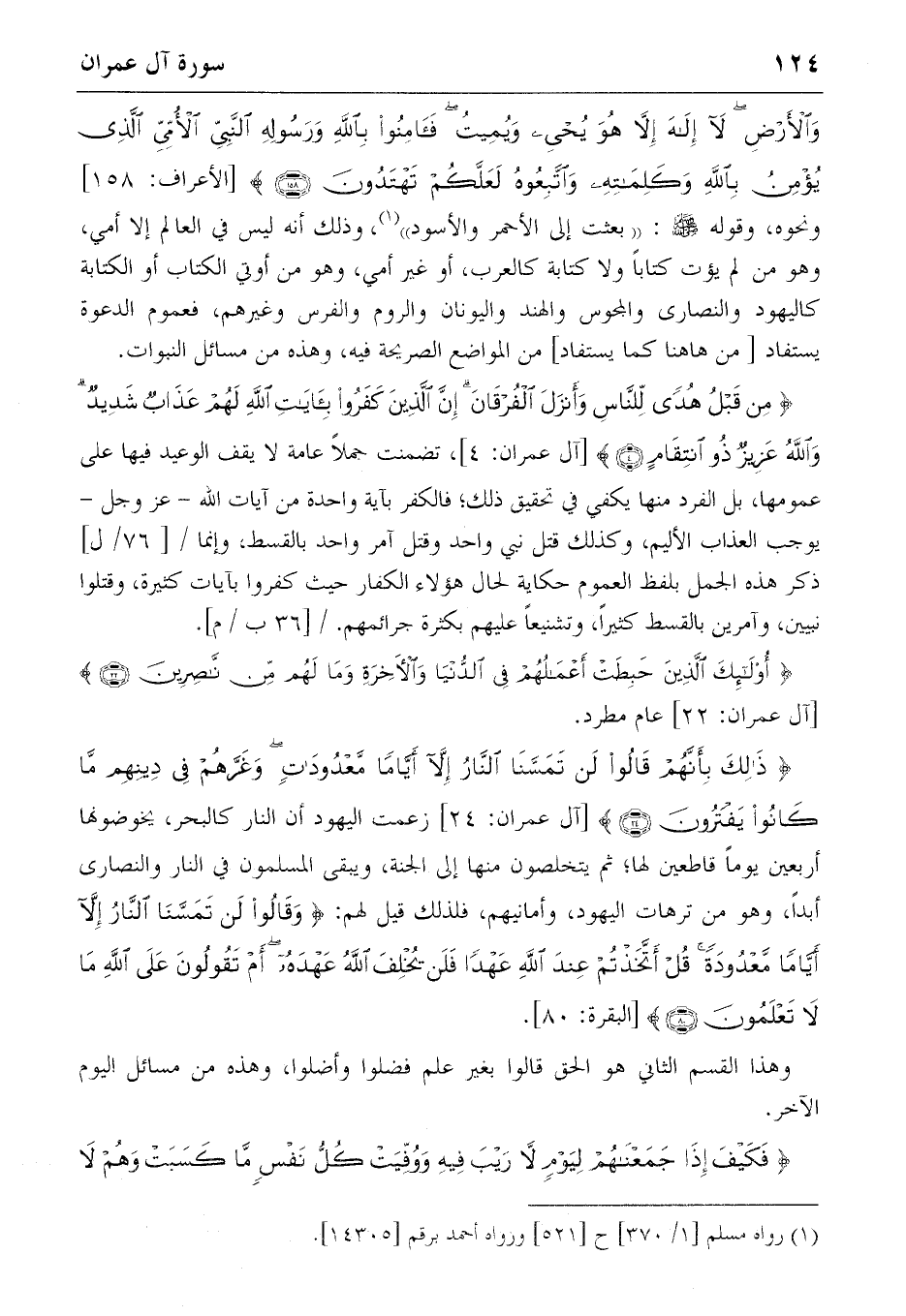 {مِنْ قَبْلُ هُدىً لِلنّاسِ وَأَنْزَلَ الْفُرْقانَ إِنَّ الَّذِينَ كَفَرُوا بِآياتِ اللهِ لَهُمْ عَذابٌ شَدِيدٌ وَاللهُ عَزِيزٌ ذُو اِنْتِقامٍ} (4) [آل عمران: 4]، تضمنت جملا عامة لا يقف الوعيد فيها على عمومها، بل الفرد منها يكفي في تحقيق ذلك؛ فالكفر بآية واحدة من آيات الله-عز وجل- يوجب العذاب الأليم، وكذلك قتل نبي واحد وقتل آمر واحد بالقسط، وإنما/ [76/ل] ذكر هذه الجمل بلفظ العموم حكاية الحال هؤلاء الكفار حيث كفروا بآيات كثيرة، وقتلوا نبيين، وآمرين بالقسط كثيرا، وتشنيعا عليهم بكثرة جرائمهم. / [36 ب/م].