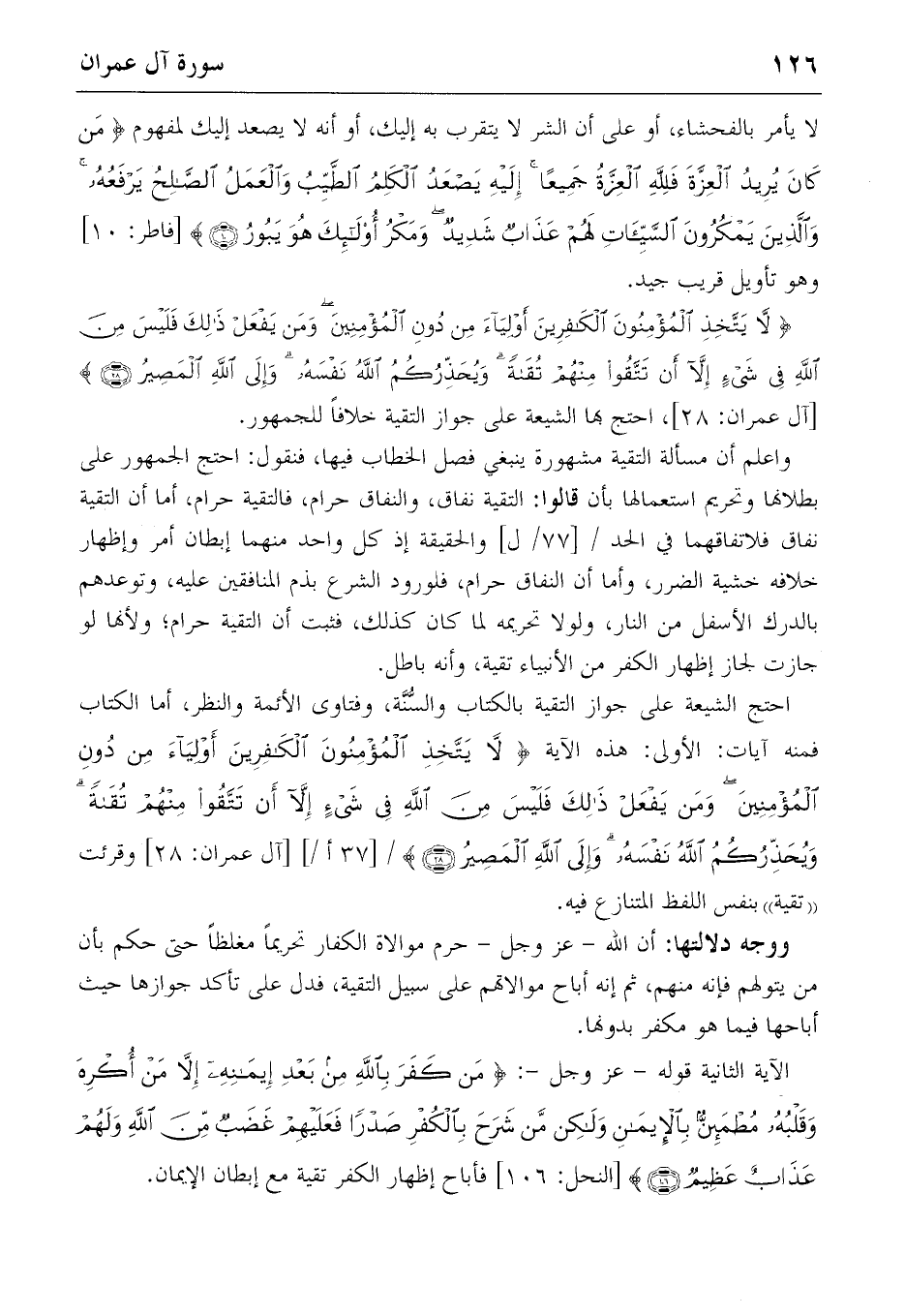 {لا يَتَّخِذِ الْمُؤْمِنُونَ الْكافِرِينَ أَوْلِياءَ مِنْ دُونِ الْمُؤْمِنِينَ وَمَنْ يَفْعَلْ ذلِكَ فَلَيْسَ مِنَ اللهِ فِي شَيْءٍ إِلاّ أَنْ تَتَّقُوا مِنْهُمْ تُقاةً وَيُحَذِّرُكُمُ اللهُ نَفْسَهُ وَإِلَى اللهِ الْمَصِيرُ} (28) [آل عمران: 28]، احتج بها الشيعة على جواز التقية خلافا للجمهور.
