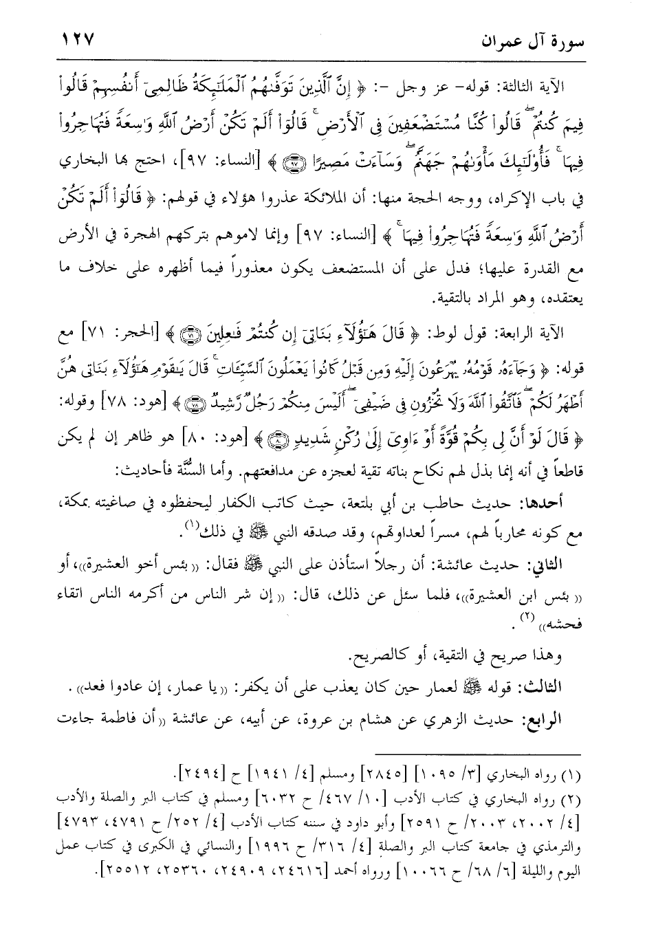 الآية الثالثة: قوله-عز وجل-: {إِنَّ الَّذِينَ تَوَفّاهُمُ الْمَلائِكَةُ ظالِمِي أَنْفُسِهِمْ قالُوا فِيمَ كُنْتُمْ قالُوا كُنّا مُسْتَضْعَفِينَ فِي الْأَرْضِ قالُوا أَلَمْ تَكُنْ أَرْضُ اللهِ واسِعَةً فَتُهاجِرُوا فِيها فَأُولئِكَ مَأْواهُمْ جَهَنَّمُ وَساءَتْ مَصِيراً} (97) [النساء: 97]، احتج بها البخاري في باب الإكراه، ووجه الحجة منها: أن الملائكة عذروا هؤلاء في قولهم: {قالُوا أَلَمْ تَكُنْ أَرْضُ اللهِ واسِعَةً فَتُهاجِرُوا فِيها} [النساء: 97] وإنما لاموهم بتركهم الهجرة في الأرض مع القدرة عليها؛ فدل على أن المستضعف يكون معذورا فيما أظهره على خلاف ما يعتقده، وهو المراد بالتقية.