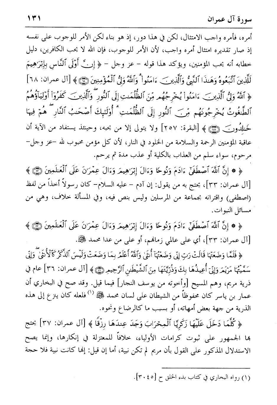 {* إِنَّ اللهَ اِصْطَفى آدَمَ وَنُوحاً وَآلَ إِبْراهِيمَ وَآلَ عِمْرانَ عَلَى الْعالَمِينَ} (33) [آل عمران: 33]، يحتج به من يقول: إن آدم-عليه السّلام-كان رسولا أخذا من لفظ (اصطفى) واقترانه بجماعة من المرسلين وليس بنص فيه، وفي المسألة خلاف، وهي من مسائل النبوات.