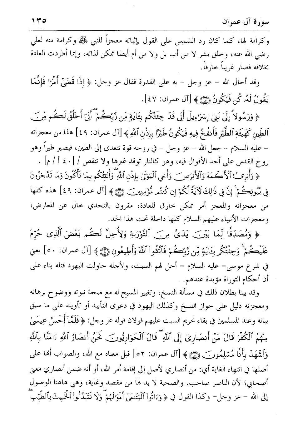 وقد بينا بطلان ذلك في مسألة النسخ، وتغيير المسيح له مع صحة نبوته ووضوح برهانه ومعجزته دليل على جواز النسخ وكذلك اليهود في دعوى التأييد أو تأويله على ما سبق بيانه وعند المسلمين في بقاء تحريم السبت عليهم قولان قوله عز وجل: {فَلَمّا أَحَسَّ عِيسى مِنْهُمُ الْكُفْرَ قالَ مَنْ أَنْصارِي إِلَى اللهِ قالَ الْحَوارِيُّونَ نَحْنُ أَنْصارُ اللهِ آمَنّا بِاللهِ وَاِشْهَدْ بِأَنّا مُسْلِمُونَ} (52) [آل عمران: 52] قيل معناه مع الله، والصواب أنها على أصلها في انتهاء الغاية أي: من أنصاري لأصل إلى إقامة أمر الله، أو أنه ضمن أنصاري معنى أصحابي؛ لأن الناصر صاحب. والصحبة لا بد لها من مقصد وغاية، وهي هاهنا الوصول إلى الله-عز وجل-وكذا القول في {وَآتُوا الْيَتامى أَمْوالَهُمْ وَلا تَتَبَدَّلُوا الْخَبِيثَ بِالطَّيِّبِ}