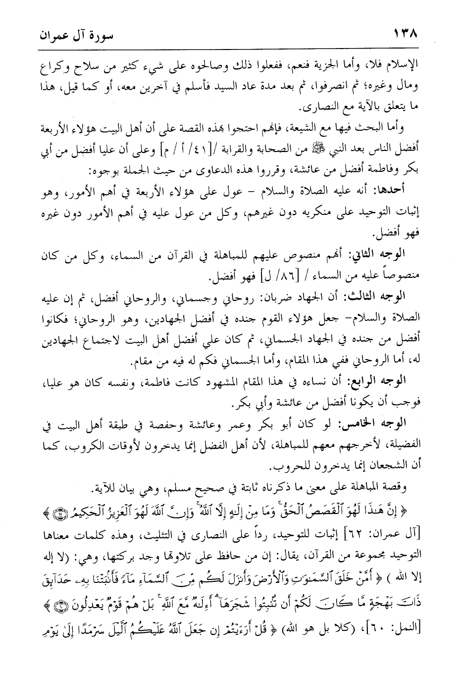 وأما البحث فيها مع الشيعة، فإنهم احتجوا بهذه القصة على أن أهل البيت هؤلاء الأربعة أفضل الناس بعد النبي صلّى الله عليه وسلّم من الصحابة والقرابة/ [41/أ/م] وعلى أن عليا أفضل من أبي بكر وفاطمة أفضل من عائشة، وقرروا هذه الدعاوى من حيث الجملة بوجوه: