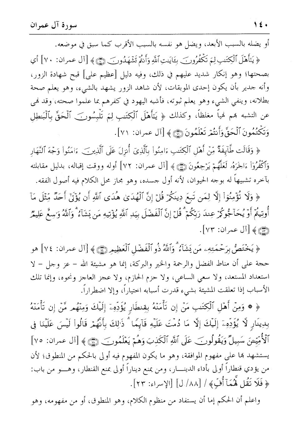{* وَمِنْ أَهْلِ الْكِتابِ مَنْ إِنْ تَأْمَنْهُ بِقِنْطارٍ يُؤَدِّهِ إِلَيْكَ وَمِنْهُمْ مَنْ إِنْ تَأْمَنْهُ بِدِينارٍ لا يُؤَدِّهِ إِلَيْكَ إِلاّ ما دُمْتَ عَلَيْهِ قائِماً ذلِكَ بِأَنَّهُمْ قالُوا لَيْسَ عَلَيْنا فِي الْأُمِّيِّينَ سَبِيلٌ وَيَقُولُونَ عَلَى اللهِ الْكَذِبَ وَهُمْ يَعْلَمُونَ} (75) [آل عمران: 75] يستشهد بها على مفهوم الموافقة، وهو ما يكون المفهوم فيه أولى بالحكم من المنطوق؛ لأن من يؤدي قنطارا أولى بأداء الدينار، ومن يمنع دينارا أولى بمنع القنطار، وهو من باب: