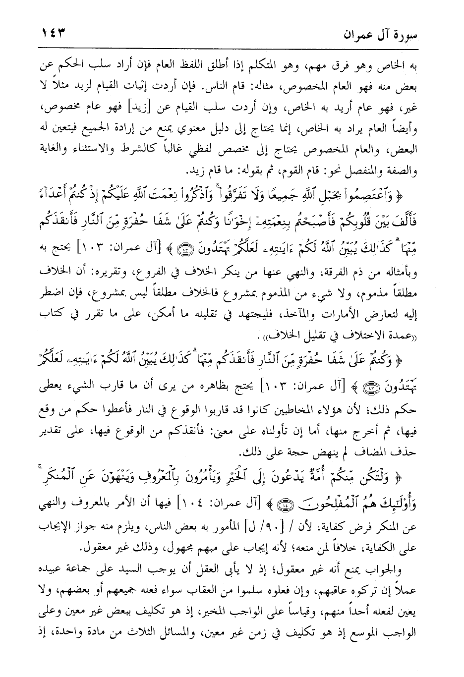 {وَاِعْتَصِمُوا بِحَبْلِ اللهِ جَمِيعاً وَلا تَفَرَّقُوا وَاُذْكُرُوا نِعْمَتَ اللهِ عَلَيْكُمْ إِذْ كُنْتُمْ أَعْداءً فَأَلَّفَ بَيْنَ قُلُوبِكُمْ فَأَصْبَحْتُمْ بِنِعْمَتِهِ إِخْواناً وَكُنْتُمْ عَلى شَفا حُفْرَةٍ مِنَ النّارِ فَأَنْقَذَكُمْ مِنْها كَذلِكَ يُبَيِّنُ اللهُ لَكُمْ آياتِهِ لَعَلَّكُمْ تَهْتَدُونَ} (103) [آل عمران: 103] يحتج به وبأمثاله من ذم الفرقة، والنهي عنها من ينكر الخلاف في الفروع، وتقريره: أن الخلاف مطلقا مذموم، ولا شيء من المذموم بمشروع فالخلاف مطلقا ليس بمشروع، فإن اضطر إليه لتعارض الأمارات والماخذ، فليجتهد في تقليله ما أمكن، على ما تقرر في كتاب «عمدة الاختلاف في تقليل الخلاف».