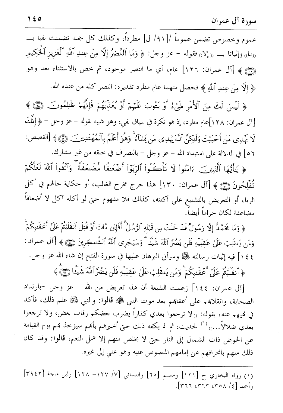 [آل عمران: 144] زعمت الشيعة أن هذا تعريض من الله-عز وجل-بارتداد الصحابة، وانقلابهم على أعقابهم بعد موت النبي صلّى الله عليه وسلّم قالوا: والنبي صلّى الله عليه وسلّم علم ذلك، فأكد في نهيهم عنه، بقوله: «لا ترجعوا بعدي كفارا يضرب بعضكم رقاب بعض، ولا ترجعوا بعدي ضلالا. . .» (1) الحديث، ثم لم يكفه ذلك حتى أخبرهم بأنهم سيؤخذ بهم يوم القيامة عن الحوض ذات الشمال إلى النار حتى لا يخلص منهم إلا همل النعم، قالوا: وقد كان ذلك منهم بانحرافهم عن إمامهم المنصوص عليه وهو علي إلى غيره.
