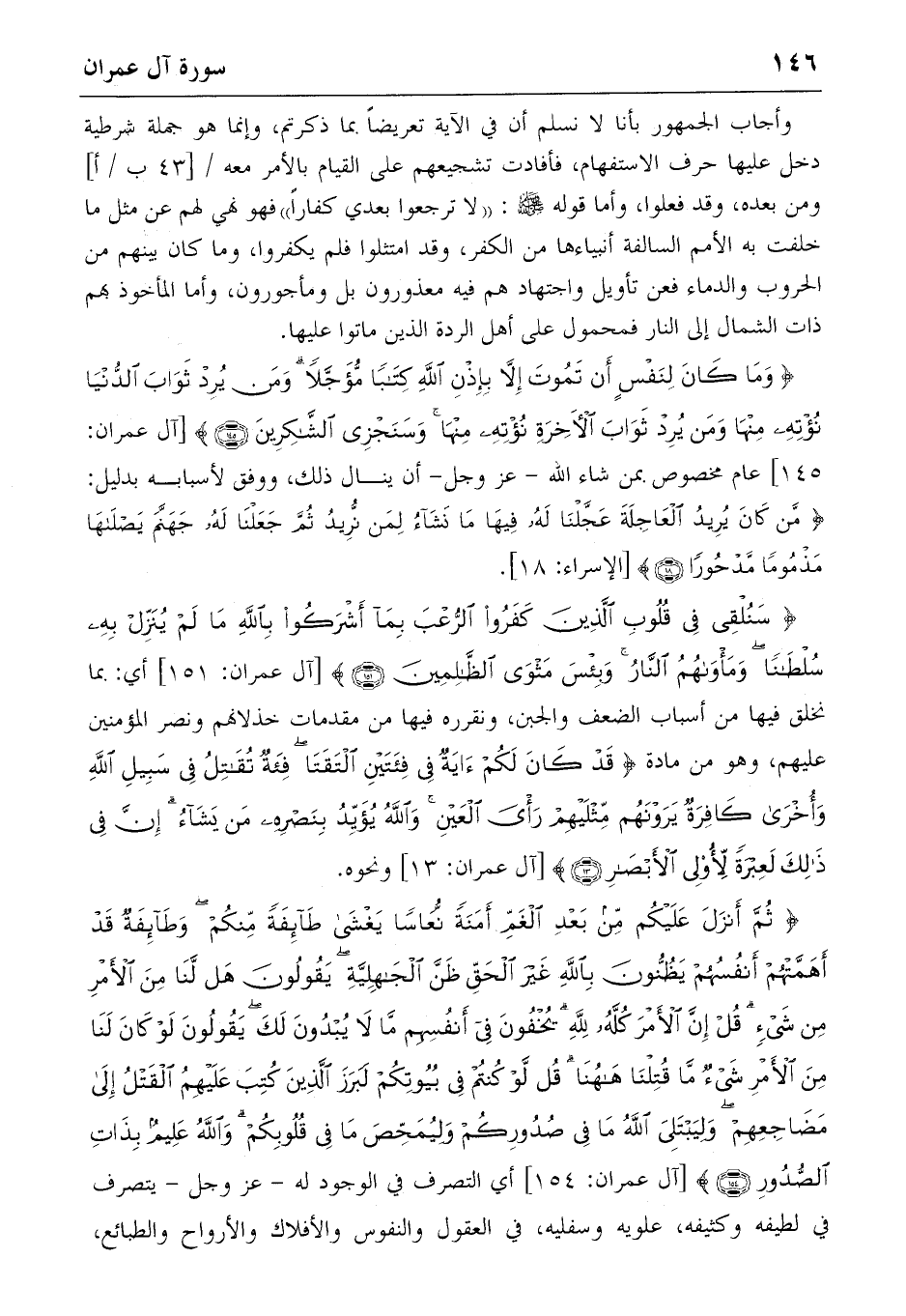 وأجاب الجمهور بأنا لا نسلم أن في الآية تعريضا بما ذكرتم، وإنما هو جملة شرطية دخل عليها حرف الاستفهام، فأفادت تشجيعهم على القيام بالأمر معه/ [43 ب/أ] ومن بعده، وقد فعلوا، وأما قوله صلّى الله عليه وسلّم: «لا ترجعوا بعدي كفارا» فهو نهي لهم عن مثل ما خلفت به الأمم السالفة أنبياءها من الكفر، وقد امتثلوا فلم يكفروا، وما كان بينهم من الحروب والدماء فعن تأويل واجتهاد هم فيه معذورون بل ومأجورون، وأما المأخوذ بهم ذات الشمال إلى النار فمحمول على أهل الردة الذين ماتوا عليها.