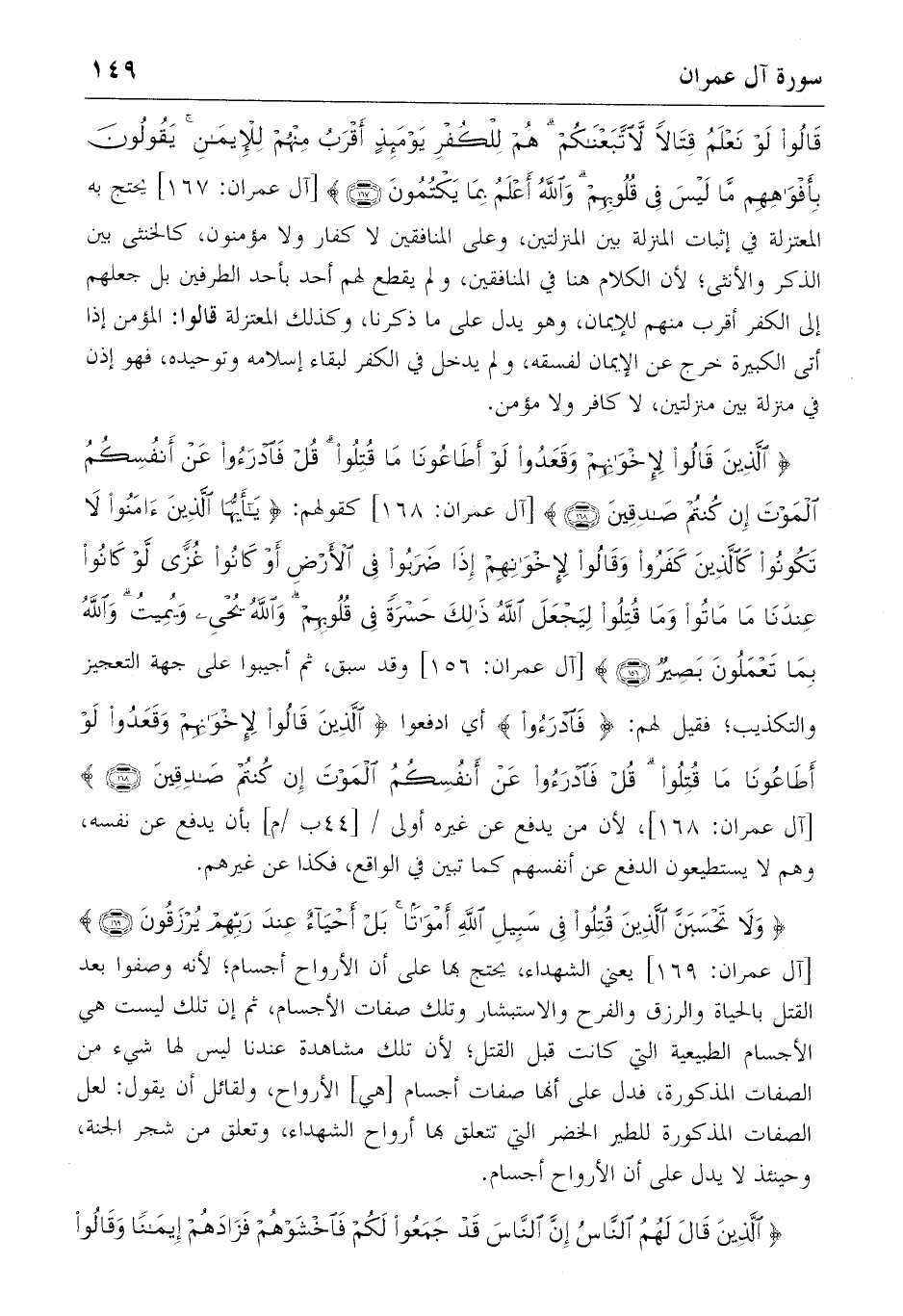 قالُوا لَوْ نَعْلَمُ قِتالاً لاتَّبَعْناكُمْ هُمْ لِلْكُفْرِ يَوْمَئِذٍ أَقْرَبُ مِنْهُمْ لِلْإِيمانِ يَقُولُونَ بِأَفْواهِهِمْ ما لَيْسَ فِي قُلُوبِهِمْ وَاللهُ أَعْلَمُ بِما يَكْتُمُونَ (167) [آل عمران: 167] يحتج به المعتزلة في إثبات المنزلة بين المنزلتين، وعلى المنافقين لا كفار ولا مؤمنون، كالخنثى بين الذكر والأنثى؛ لأن الكلام هنا في المنافقين، ولم يقطع لهم أحد بأحد الطرفين بل جعلهم إلى الكفر أقرب منهم للإيمان، وهو يدل على ما ذكرنا، وكذلك المعتزلة قالوا: المؤمن إذا أتى الكبيرة خرج عن الإيمان لفسقه، ولم يدخل في الكفر لبقاء إسلامه وتوحيده، فهو إذن في منزلة بين منزلتين، لا كافر ولا مؤمن.