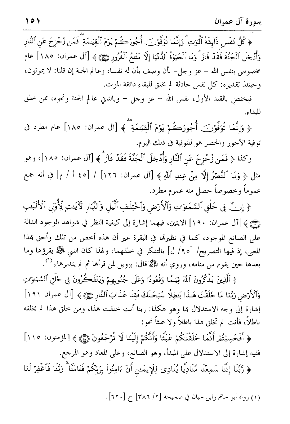 {الَّذِينَ يَذْكُرُونَ اللهَ قِياماً وَقُعُوداً وَعَلى جُنُوبِهِمْ وَيَتَفَكَّرُونَ فِي خَلْقِ السَّماواتِ وَالْأَرْضِ رَبَّنا ما خَلَقْتَ هذا باطِلاً سُبْحانَكَ فَقِنا عَذابَ النّارِ} (191) [آل عمران: 191] إشارة إلى وجه الاستدلال بها وهو هكذا: ربنا أنت خلقت هذا، ومن خلق هذا لم يخلقه باطلا، فأنت لم تخلق هذا باطلا ولا عبثا نحو: