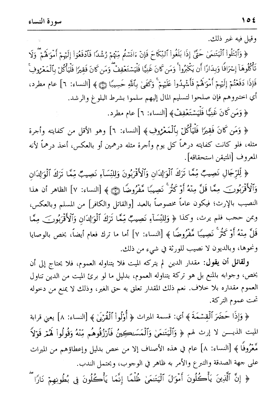 {لِلرِّجالِ نَصِيبٌ مِمّا تَرَكَ الْوالِدانِ وَالْأَقْرَبُونَ وَلِلنِّساءِ نَصِيبٌ مِمّا تَرَكَ الْوالِدانِ وَالْأَقْرَبُونَ مِمّا قَلَّ مِنْهُ أَوْ كَثُرَ نَصِيباً مَفْرُوضاً} (7) [النساء: 7] الظاهر أن هذا النصيب بالإرث؛ فيكون عاما مخصوصا بالعبد [والقاتل والكافر] من المسلم وبالعكس، وبمن حجب فلم يرث، وكذا {وَلِلنِّساءِ نَصِيبٌ مِمّا تَرَكَ الْوالِدانِ وَالْأَقْرَبُونَ مِمّا قَلَّ مِنْهُ أَوْ كَثُرَ نَصِيباً مَفْرُوضاً} [النساء: 7] أما ما ترك فعام أيضا، يخص بالوصايا ونحوها، وبالديون لا نصيب للورثة في شيء من ذلك.