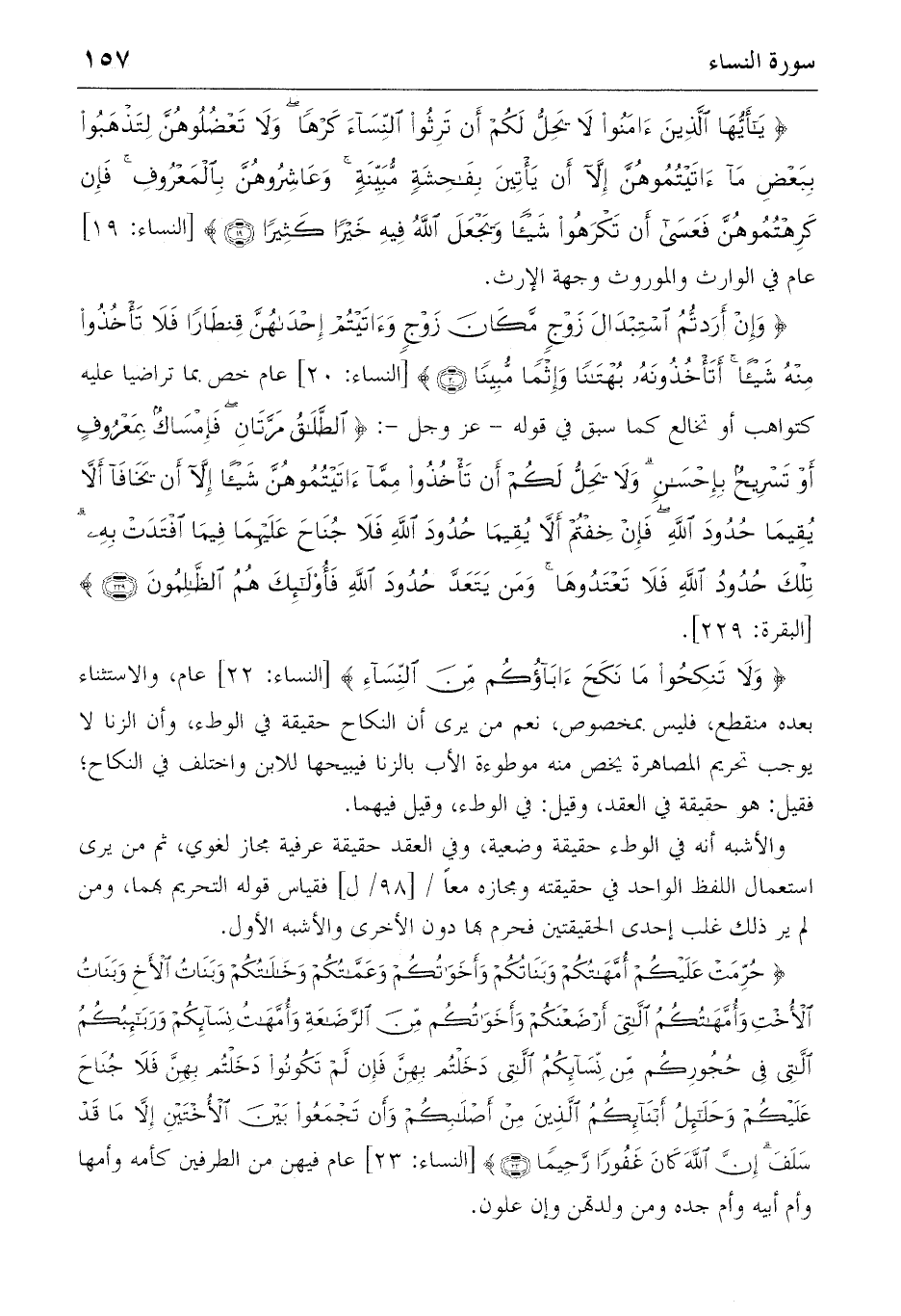 {يا أَيُّهَا الَّذِينَ آمَنُوا لا يَحِلُّ لَكُمْ أَنْ تَرِثُوا النِّساءَ كَرْهاً وَلا تَعْضُلُوهُنَّ لِتَذْهَبُوا بِبَعْضِ ما آتَيْتُمُوهُنَّ إِلاّ أَنْ يَأْتِينَ بِفاحِشَةٍ مُبَيِّنَةٍ وَعاشِرُوهُنَّ بِالْمَعْرُوفِ فَإِنْ كَرِهْتُمُوهُنَّ فَعَسى أَنْ تَكْرَهُوا شَيْئاً وَيَجْعَلَ اللهُ فِيهِ خَيْراً كَثِيراً} (19) [النساء: 19] عام في الوارث والموروث وجهة الإرث.