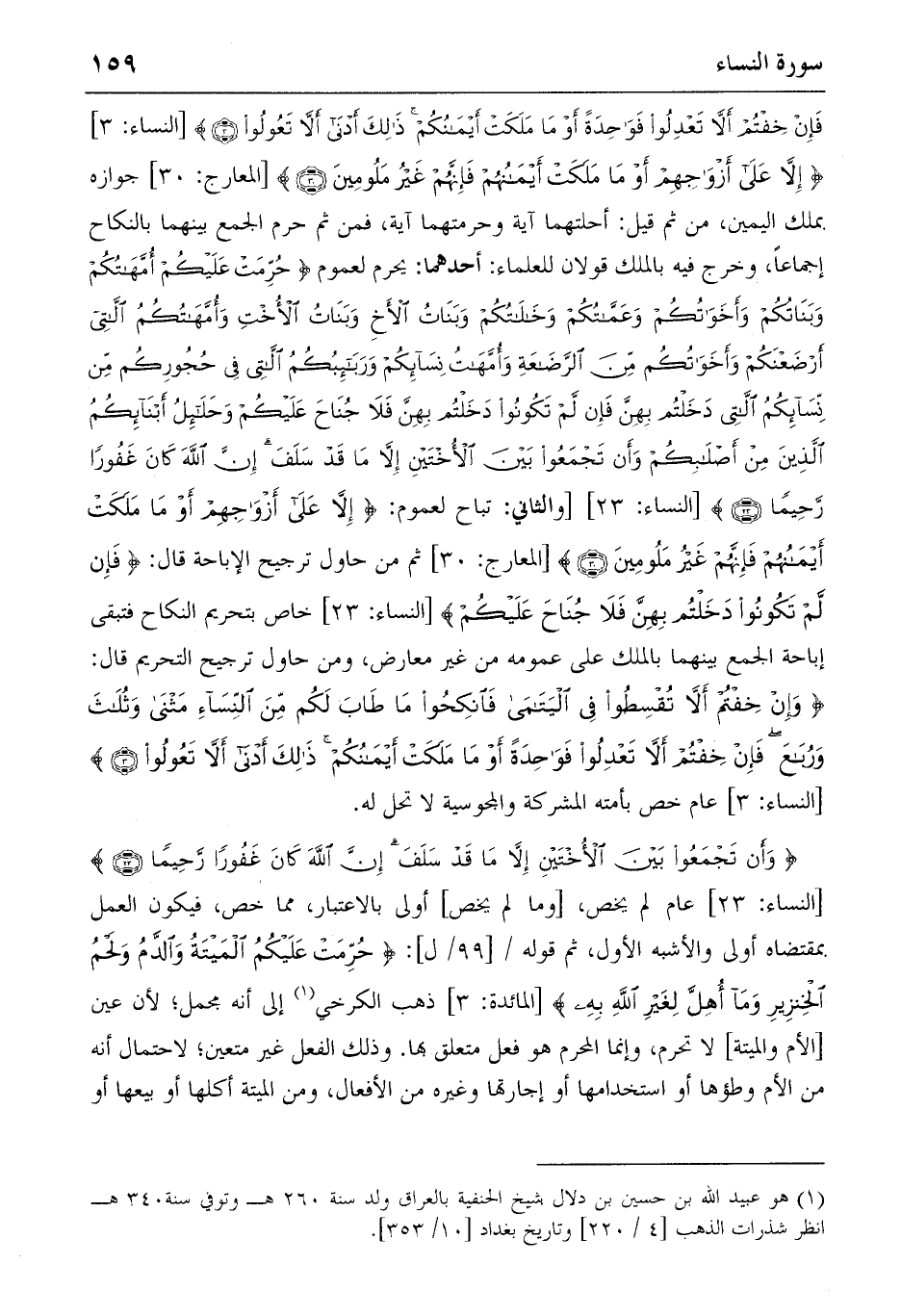 {وَأَنْ تَجْمَعُوا بَيْنَ الْأُخْتَيْنِ إِلاّ ما قَدْ سَلَفَ إِنَّ اللهَ كانَ غَفُوراً رَحِيماً} (23) [النساء: 23] عام لم يخص، [وما لم يخص] أولى بالاعتبار، مما خص، فيكون العمل بمقتضاه أولى والأشبه الأول، ثم قوله/ [99/ل]: {حُرِّمَتْ عَلَيْكُمُ الْمَيْتَةُ وَالدَّمُ وَلَحْمُ الْخِنْزِيرِ وَما أُهِلَّ لِغَيْرِ اللهِ بِهِ} [المائدة: 3] ذهب الكرخي (1) إلى أنه مجمل؛ لأن عين [الأم والميتة] لا تحرم، وإنما المحرم هو فعل متعلق بها. وذلك الفعل غير متعين؛ لاحتمال أنه من الأم وطؤها أو استخدامها أو إجارتها وغيره من الأفعال، ومن الميتة أكلها أو بيعها أو