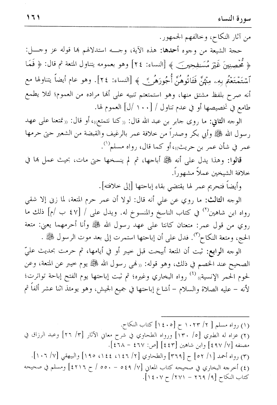 الوجه الثاني: ما روى جابر بن عبد الله قال: «كنا نتمتع»، أو قال: «تمتعنا على عهد رسول الله صلّى الله عليه وسلّم وأبي بكر وصدرا من خلافة عمر بالرغيف والقبضة من الشعير حتى حرمها عمر في شأن عمر بن حريث»، أو كما قال، رواه مسلم (1).