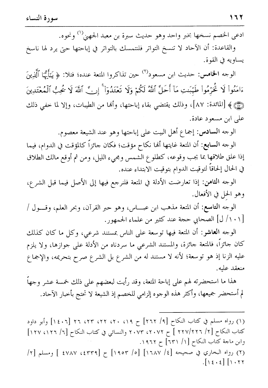 هذا ما استحضرته لهم على إباحة المتعة، وقد رأيت لبعضهم على ذلك خمسة عشر وجها لم أستحضر جميعها، وأكثر هذه الوجوه إلزامي للخصم إذ الشيعة لا تحتج بأخبار الآحاد.