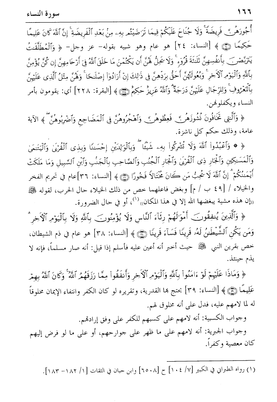 {* وَاُعْبُدُوا اللهَ وَلا تُشْرِكُوا بِهِ شَيْئاً وَبِالْوالِدَيْنِ إِحْساناً وَبِذِي الْقُرْبى وَالْيَتامى وَالْمَساكِينِ وَالْجارِ ذِي الْقُرْبى وَالْجارِ الْجُنُبِ وَالصّاحِبِ بِالْجَنْبِ وَاِبْنِ السَّبِيلِ وَما مَلَكَتْ أَيْمانُكُمْ إِنَّ اللهَ لا يُحِبُّ مَنْ كانَ مُخْتالاً فَخُوراً} (36) [النساء: 36] عام في تحريم الفخر والخيلاء/ [49 ب/م] وبغض فاعلهما خص من ذلك الخيلاء حال الحرب، لقوله صلّى الله عليه وسلّم «إن هذه مشية يبغضها الله إلا في هذا المكان» (1)، أو في حال الضرورة.