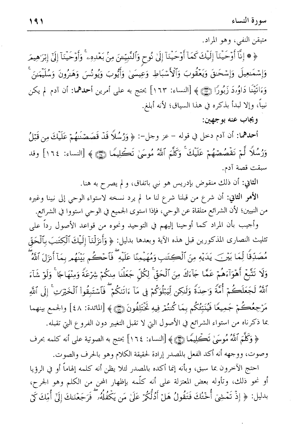 {* إِنّا أَوْحَيْنا إِلَيْكَ كَما أَوْحَيْنا إِلى نُوحٍ وَالنَّبِيِّينَ مِنْ بَعْدِهِ وَأَوْحَيْنا إِلى إِبْراهِيمَ وَإِسْماعِيلَ وَإِسْحاقَ وَيَعْقُوبَ وَالْأَسْباطِ وَعِيسى وَأَيُّوبَ وَيُونُسَ وَهارُونَ وَسُلَيْمانَ وَآتَيْنا داوُدَ زَبُوراً} (163) [النساء: 163] يحتج به على أمرين أحدهما: أن آدم لم يكن نبيا، وإلا لبدأ بذكره في هذا السياق؛ لأنه أبلغ.