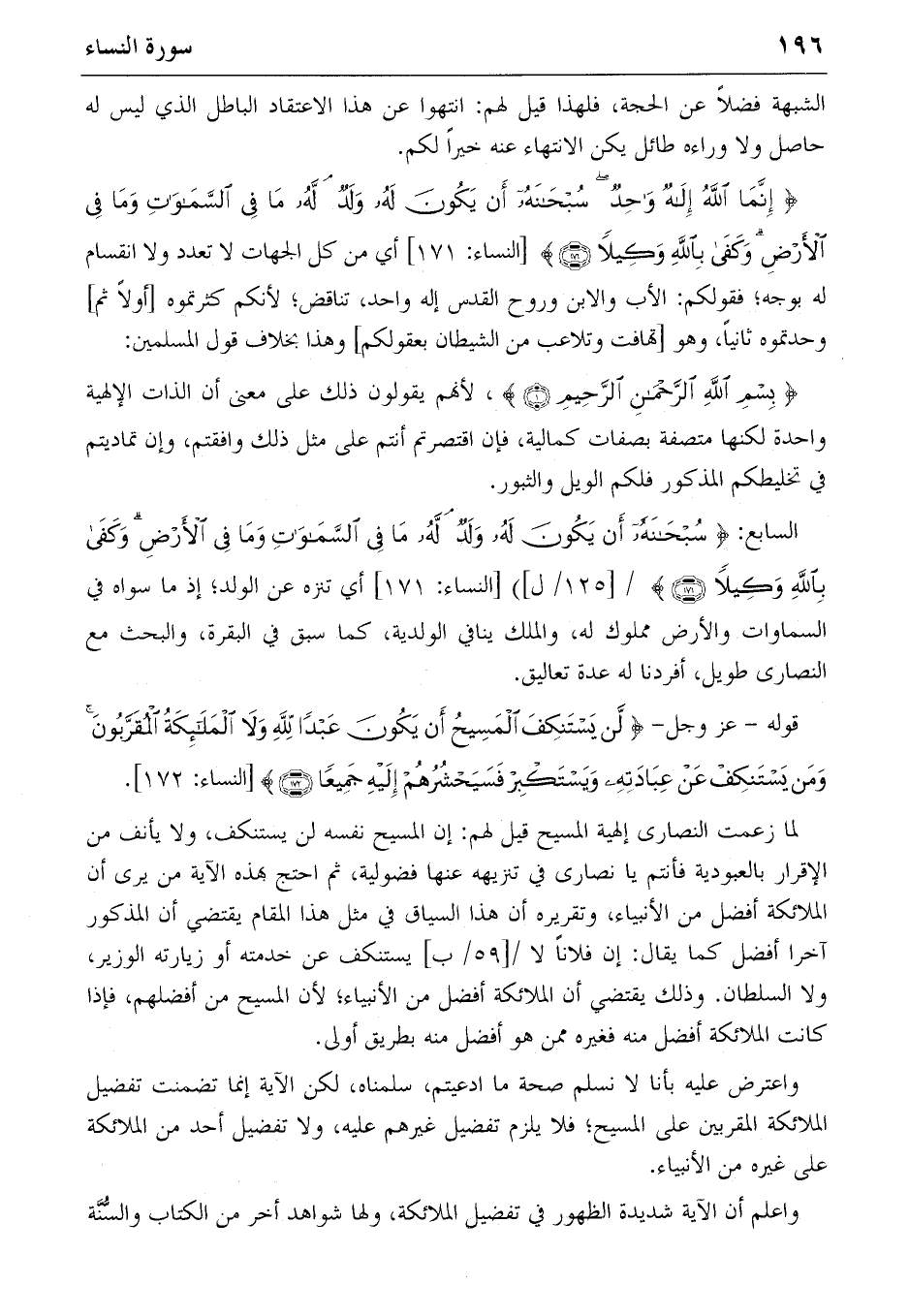 واعترض عليه بأنا لا نسلم صحة ما ادعيتم، سلمناه، لكن الآية إنما تضمنت تفضيل الملائكة المقربين على المسيح؛ فلا يلزم تفضيل غيرهم عليه، ولا تفضيل أحد من الملائكة على غيره من الأنبياء.