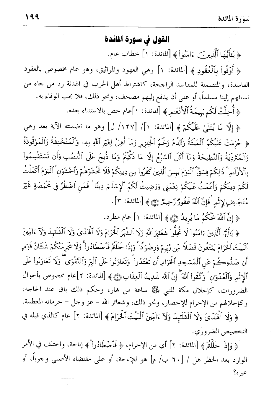{يا أَيُّهَا الَّذِينَ آمَنُوا لا تُحِلُّوا شَعائِرَ اللهِ وَلا الشَّهْرَ الْحَرامَ وَلا الْهَدْيَ وَلا الْقَلائِدَ وَلا آمِّينَ الْبَيْتَ الْحَرامَ يَبْتَغُونَ فَضْلاً مِنْ رَبِّهِمْ وَرِضْواناً وَإِذا حَلَلْتُمْ فَاصْطادُوا وَلا يَجْرِمَنَّكُمْ شَنَآنُ قَوْمٍ أَنْ صَدُّوكُمْ عَنِ الْمَسْجِدِ الْحَرامِ أَنْ تَعْتَدُوا وَتَعاوَنُوا عَلَى الْبِرِّ وَالتَّقْوى وَلا تَعاوَنُوا عَلَى الْإِثْمِ وَالْعُدْوانِ وَاِتَّقُوا اللهَ إِنَّ اللهَ شَدِيدُ الْعِقابِ} (2) [المائدة: 2] عام مخصوص بأحوال الضرورات، كإحلال مكة للنبي صلّى الله عليه وسلّم ساعة من نهار، وحكم ذلك باق عند الحاجة، وكإحلالهم من الإحرام للإحصار، ونحو ذلك، وشعائر الله-عز وجل-حرماته المعظمة.