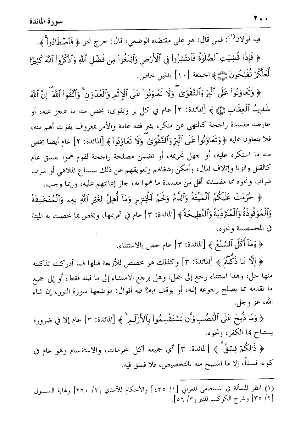 {وَتَعاوَنُوا عَلَى الْبِرِّ وَالتَّقْوى وَلا تَعاوَنُوا عَلَى الْإِثْمِ وَالْعُدْوانِ وَاِتَّقُوا اللهَ إِنَّ اللهَ شَدِيدُ الْعِقابِ} (2) [المائدة: 2] عام في كل بر وتقوى، يخص منه ما عجز عنه، أو عارضه مفسدة راجحة كالنهي عن منكر، يثير فتنة عامة والأمر بمعروف يفوت أهم منه، فلا يتعاون عليه {وَتَعاوَنُوا عَلَى الْبِرِّ وَالتَّقْوى وَلا تَعاوَنُوا} [المائدة: 2] عام أيضا يخص منه ما استكره عليه، أو جهل تحريمه، أو تضمن مصلحة راجحة لقوم هموا بفسق عام كالقتل والزنا وإتلاف المال، وأمكن إشغالهم وتعويقهم عن ذلك بسماع الملاهي أو شرب شراب ونحوه مما مفسدته أقل من مفسدة ما هموا به، جاز إعانتهم عليه، وربما وجب.