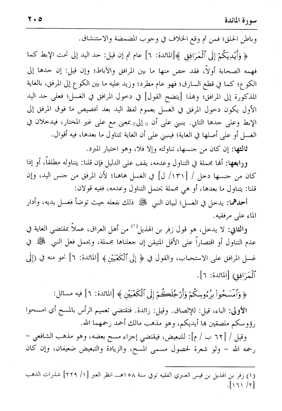 والثاني: لا يدخل، هو قول زفر بن الهذيل (1) من أهل العراق، عملا بمقتضى الغاية في عدم التناول أو اقتصارا على الأقل المتيقن إن جعلناها مجملة، ويحمل فعل النبي صلّى الله عليه وسلّم في غسل المرافق على الاستحباب، والقول في {إِلَى الْكَعْبَيْنِ} [المائدة: 6] نحو منه في {إِلَى الْمَرافِقِ} [المائدة: 6].