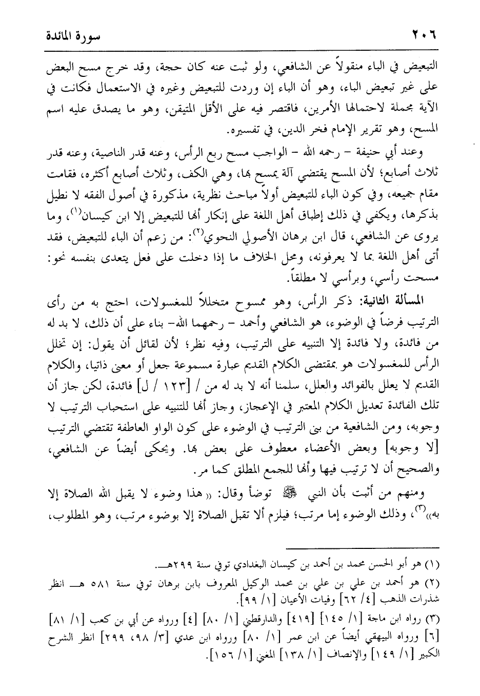 المسألة الثانية: ذكر الرأس، وهو ممسوح متخللا للمغسولات، احتج به من رأى الترتيب فرضا في الوضوء، هو الشافعي وأحمد-رحمهما الله-بناء على أن ذلك، لا بد له من فائدة، ولا فائدة إلا التنبيه على الترتيب، وفيه نظر؛ لأن لقائل أن يقول: إن تخلل الرأس للمغسولات هو بمقتضى الكلام القديم عبارة مسموعة جعل أو معنى ذاتيا، والكلام القديم لا يعلل بالفوائد والعلل، سلمنا أنه لا بد له من/ [123/ل] فائدة، لكن جاز أن تلك الفائدة تعديل الكلام المعتبر في الإعجاز، وجاز أنها للتنبيه على استحباب الترتيب لا وجوبه، ومن الشافعية من بنى الترتيب في الوضوء على كون الواو العاطفة تقتضي الترتيب [لا وجوبه] وبعض الأعضاء معطوف على بعض بها. ويحكى أيضا عن الشافعي، والصحيح أن لا ترتيب فيها وأنها للجمع المطلق كما مر.