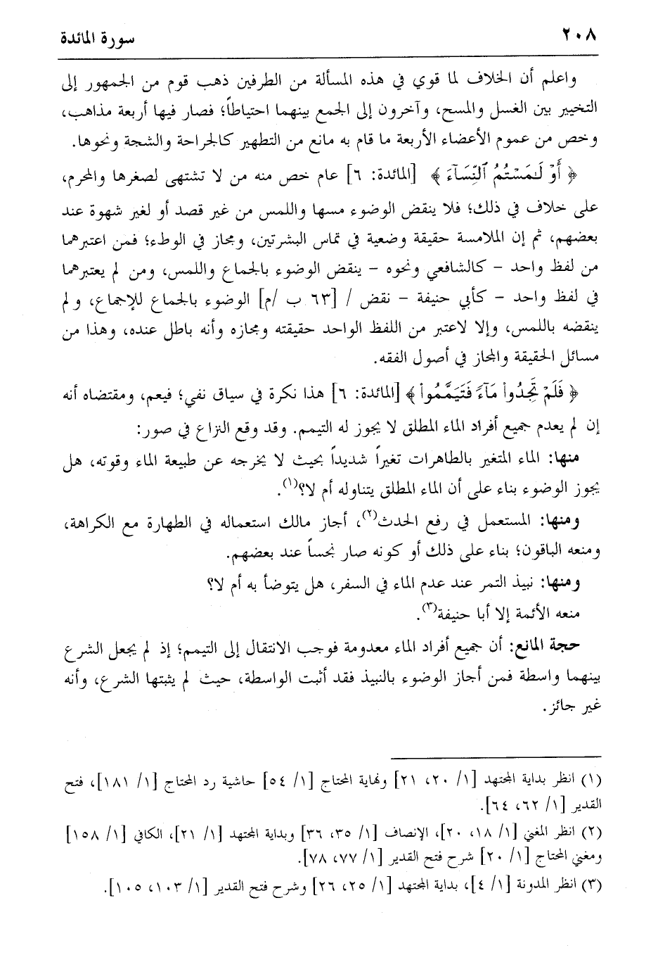 {أَوْ لامَسْتُمُ النِّساءَ} [المائدة: 6] عام خص منه من لا تشتهى لصغرها والمحرم، على خلاف في ذلك؛ فلا ينقض الوضوء مسها واللمس من غير قصد أو لغير شهوة عند بعضهم، ثم إن الملامسة حقيقة وضعية في تماس البشرتين، ومجاز في الوطء؛ فمن اعتبرهما من لفظ واحد-كالشافعي ونحوه-ينقض الوضوء بالجماع واللمس، ومن لم يعتبرهما في لفظ واحد-كأبي حنيفة-نقض/ [63 ب/م] الوضوء بالجماع للإجماع، ولم ينقضه باللمس، وإلا لاعتبر من اللفظ الواحد حقيقته ومجازه وأنه باطل عنده، وهذا من مسائل الحقيقة والمجاز في أصول الفقه.