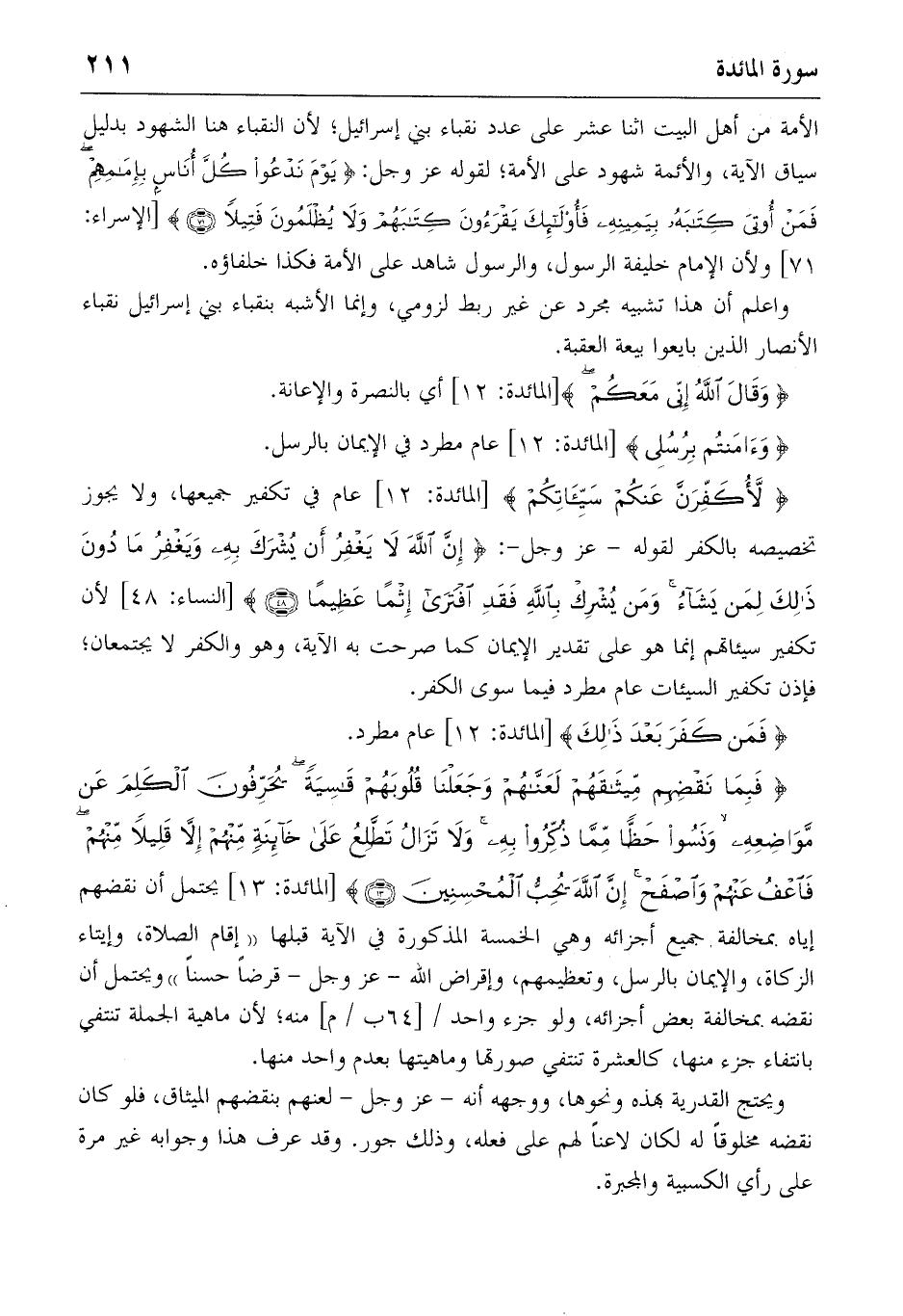 {لَأُكَفِّرَنَّ عَنْكُمْ سَيِّئاتِكُمْ} [المائدة: 12] عام في تكفير جميعها، ولا يجوز تخصيصه بالكفر لقوله-عز وجل-: {إِنَّ اللهَ لا يَغْفِرُ أَنْ يُشْرَكَ بِهِ وَيَغْفِرُ ما دُونَ ذلِكَ لِمَنْ يَشاءُ وَمَنْ يُشْرِكْ بِاللهِ فَقَدِ اِفْتَرى إِثْماً عَظِيماً} (48) [النساء: 48] لأن تكفير سيئاتهم إنما هو على تقدير الإيمان كما صرحت به الآية، وهو والكفر لا يجتمعان؛ فإذن تكفير السيئات عام مطرد فيما سوى الكفر.