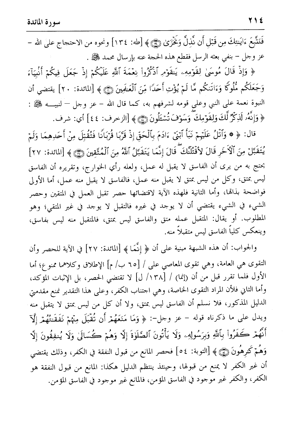 قال: {*وَاُتْلُ عَلَيْهِمْ نَبَأَ اِبْنَيْ آدَمَ بِالْحَقِّ إِذْ قَرَّبا قُرْباناً فَتُقُبِّلَ مِنْ أَحَدِهِما وَلَمْ يُتَقَبَّلْ مِنَ الْآخَرِ قالَ لَأَقْتُلَنَّكَ قالَ إِنَّما يَتَقَبَّلُ اللهُ مِنَ الْمُتَّقِينَ} (27) [المائدة: 27] يحتج به من يرى أن الفاسق لا يقبل له عمل، ولعله رأي الخوارج، وتقريره أن الفاسق ليس بمتق، وكل من ليس بمتق لا يقبل منه عمل، فالفاسق لا يقبل منه عمل، أما الأولى فواضحة بذاتها، وأما الثانية فلهذه الآية لاقتضائها حصر تقبل العمل في المتقين وحصر الشيء في الشيء يقتضي أن لا يوجد في غيره فالتقبل لا يوجد في غير المتقي؛ وهو المطلوب. أو يقال: المتقبل عمله متق والفاسق ليس بمتق، فالمتقبل منه ليس بفاسق، وينعكس كليا الفاسق ليس متقبلا منه.